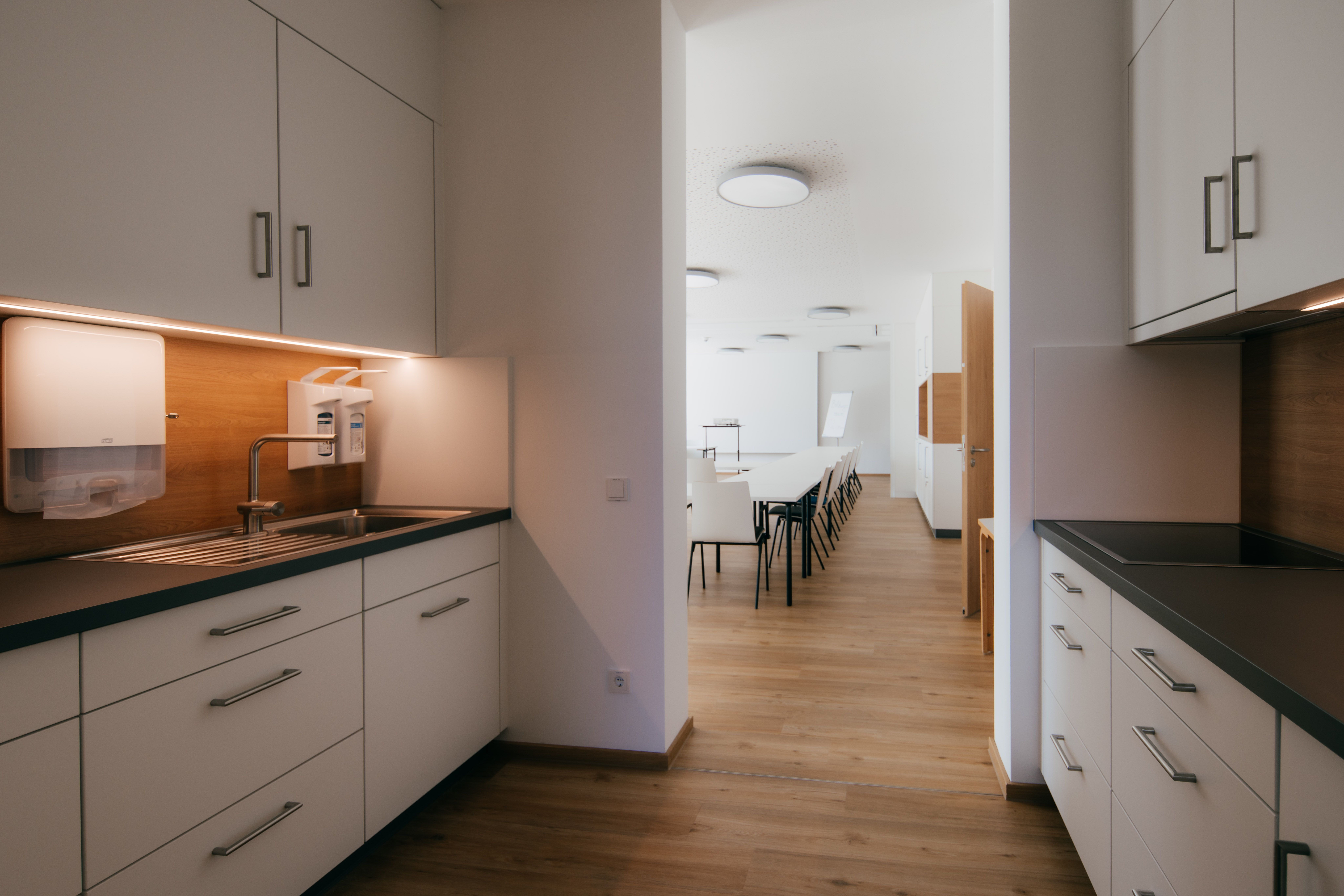 Teeküche mit Kaffeemaschine, Wasserkocher, Mikrowelle, Kühlschrank und Geschirr.