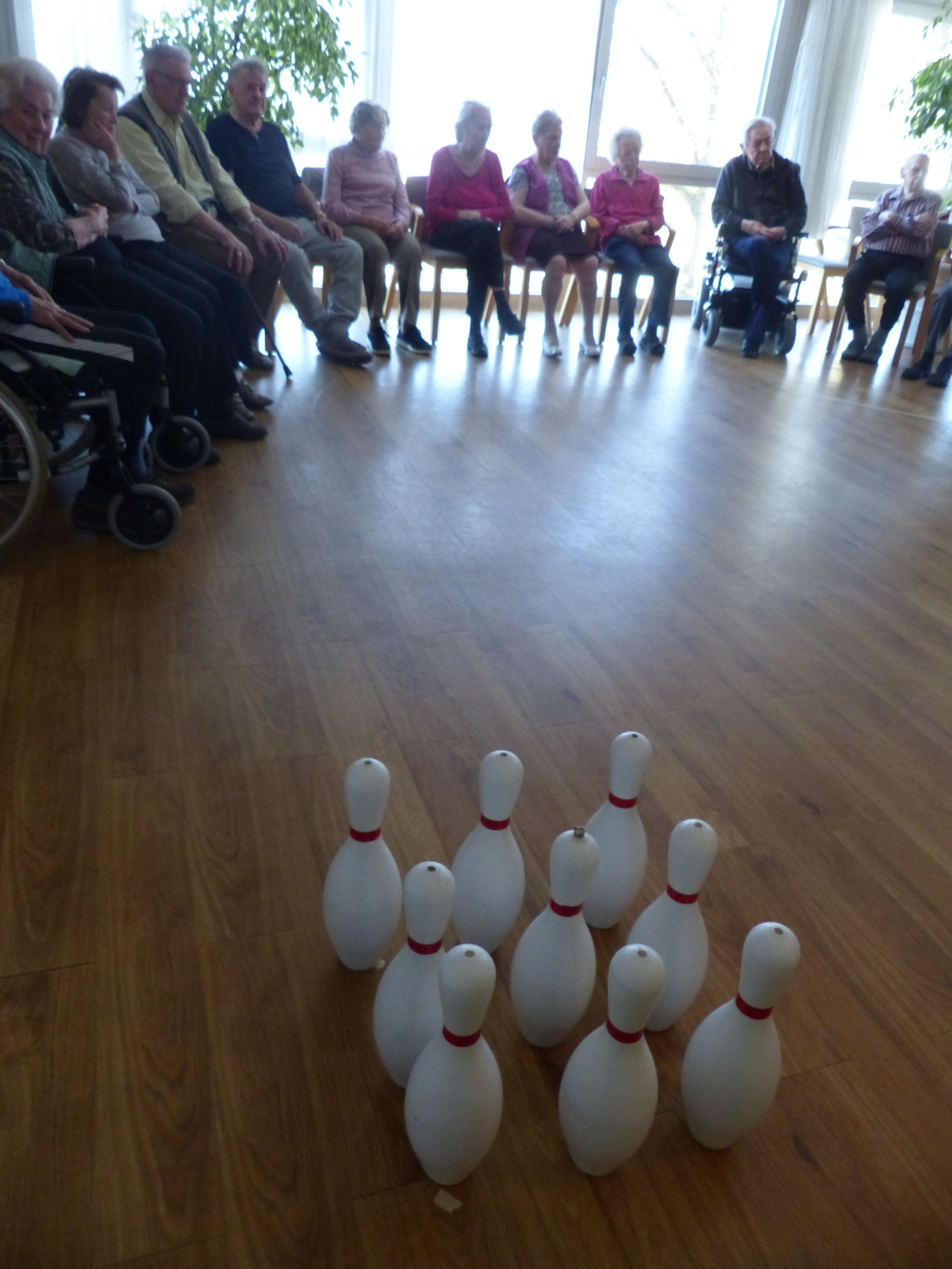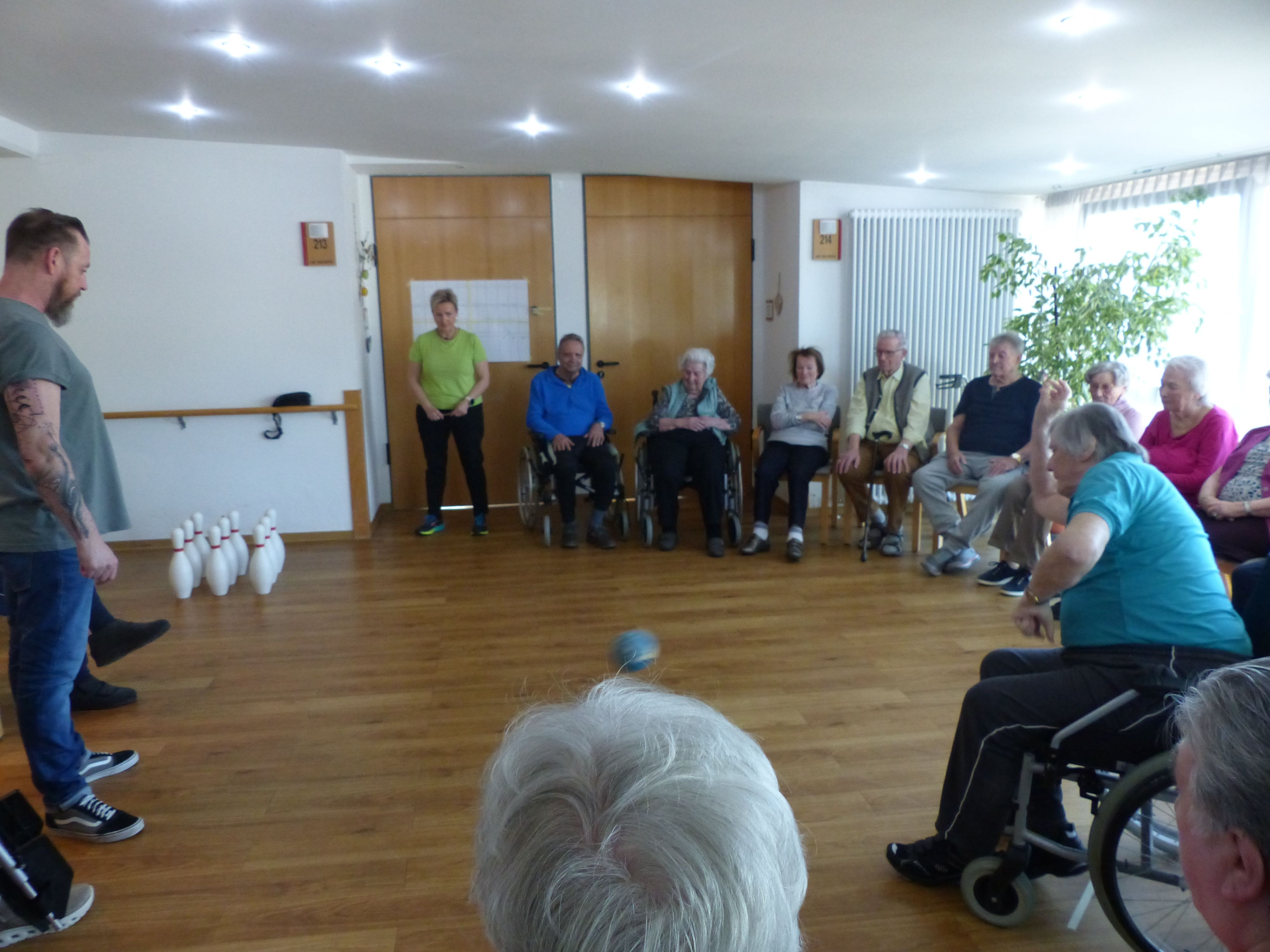 Wir sitzen zusammen oder stehen zusammen an der Bahn, lachen, feuern uns gegenseitig an und feiern gemeinsam kleine Erfolge. Man spürt, dass man dazu hört. Das Greifen der Kugel, das Zielen, das Loslassen – das fordert Koordination, ist aber überschaubar. Die leichte Bewegung tut gut und macht Spaß. Oft weht eine freundliche, spielerische Atmosphäre. Ein Gelächter hier, ein anerkennendes Kopfnicken dort – das hebt die Stimmung. Bestimmte Würfe oder Bahnnamen wecken Erinnerungen an frühere Hobbys oder vergangene Zeiten, Gespräche darüber entstehen. Der gleichmäßige Rhythmus des Spiels wirkt beruhigend. Kurze Pausen helfen, durchzuatmen und neue Kraft zu sammeln. Wir reden miteinander, bekommen Komplimente, erhalten ermutigende Worte von Pflegekräften oder Mitbewohnern. Danach gibt es oft ein gemeinsames Getränk oder Snacks. Freude, Zufriedenheit, gelegentlich Frustration – beides gehört dazu, aber es bleibt respektvoll und unterstützend.