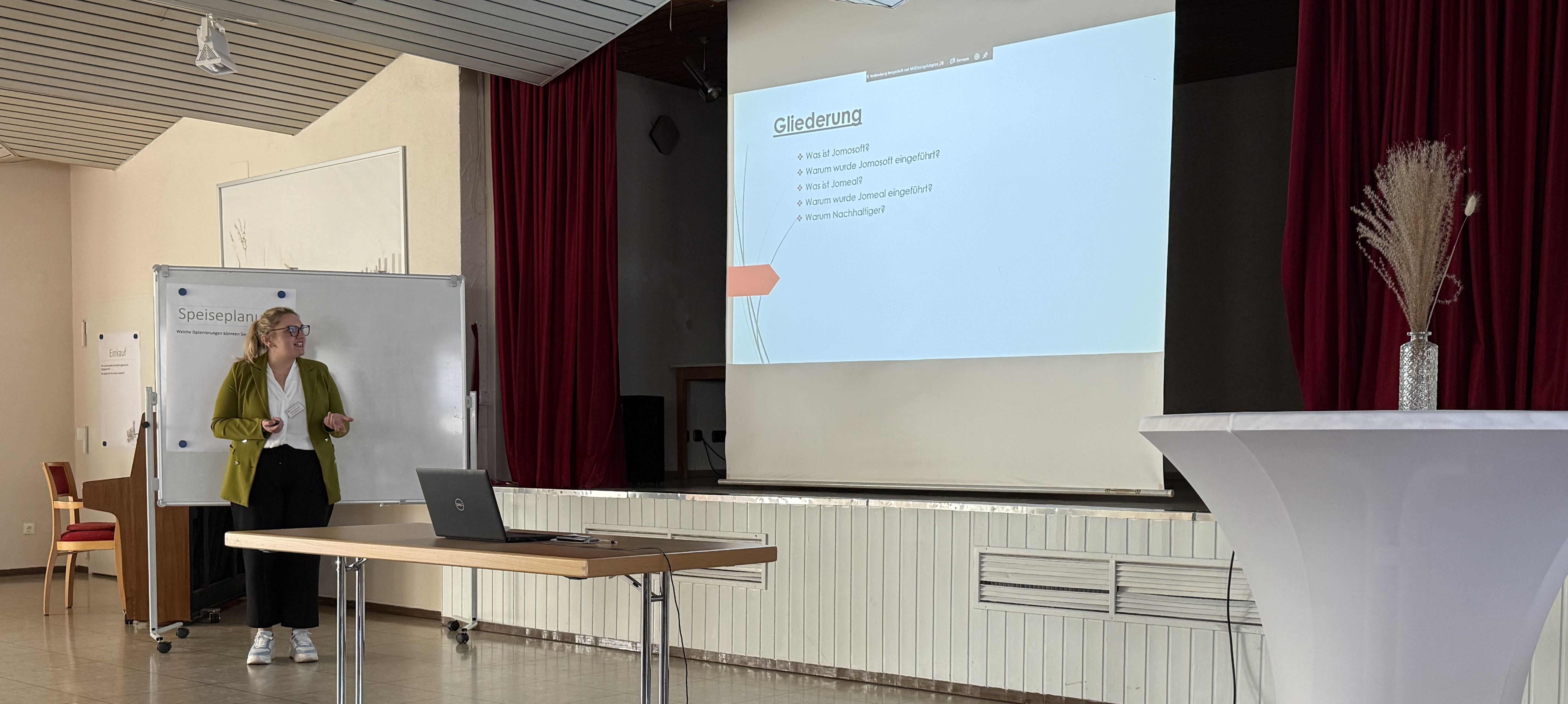 Nach der Begrüßung durch Einrichtungsleiterin Nanni Oster stellten Manuela Brummer und Pia Anwander die Nachhaltigkeitsstrategie des Hauses vor. Sie zeigten, wie bewusstes Einkaufen, ein durchdachter Speiseplan und ein funktionierendes Warenwirtschaftssystem zusammenspielen. „Nachhaltigkeit beginnt nicht erst beim Kochen, sondern viel früher“, betont Anwander. „Wir achten darauf, regionale Produzenten einzubinden und Lebensmittel vollständig zu verwerten.“