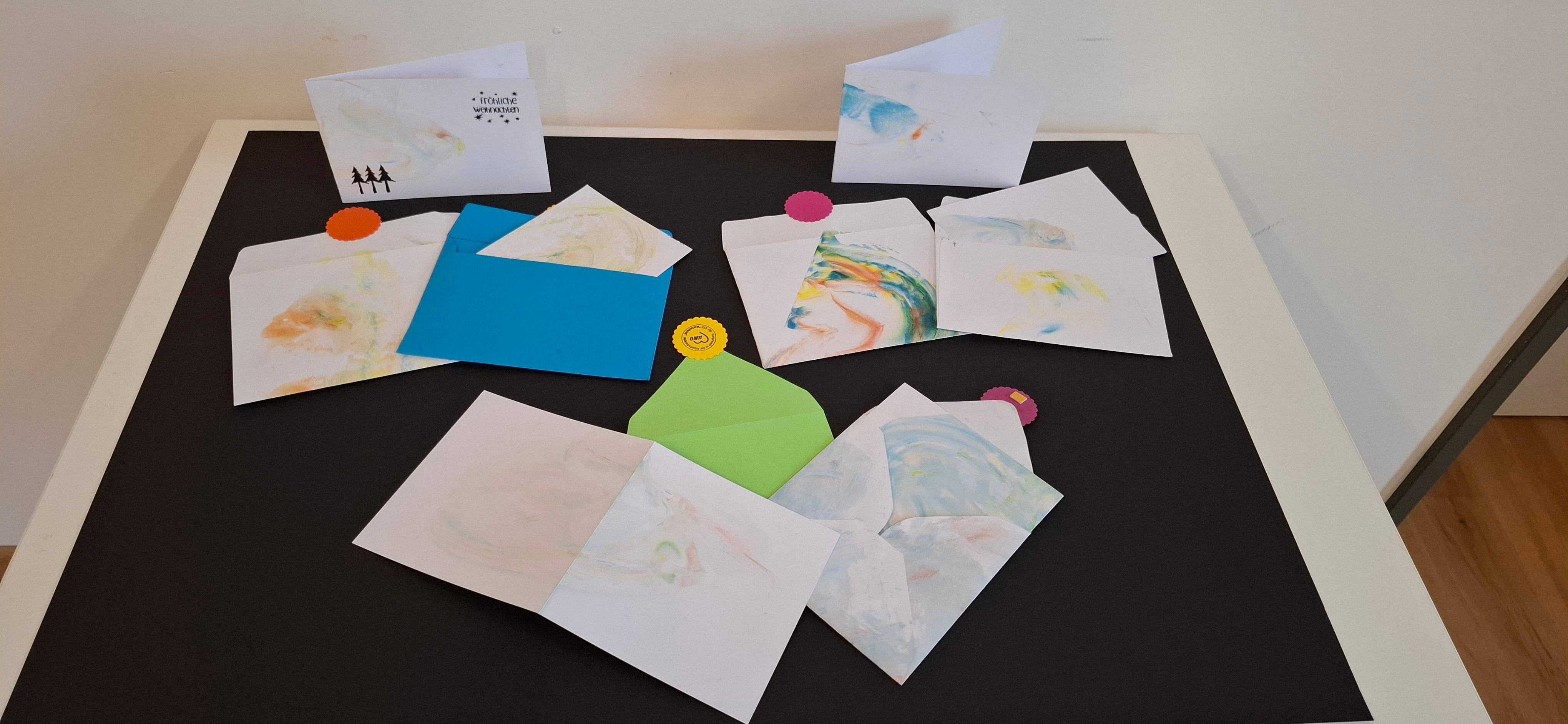 • Marmorierte Karten mit Umschlägen, welche auf Wunsch, nach Motto, von uns, aber auch selbst gestaltet werden können. (siehe Foto)