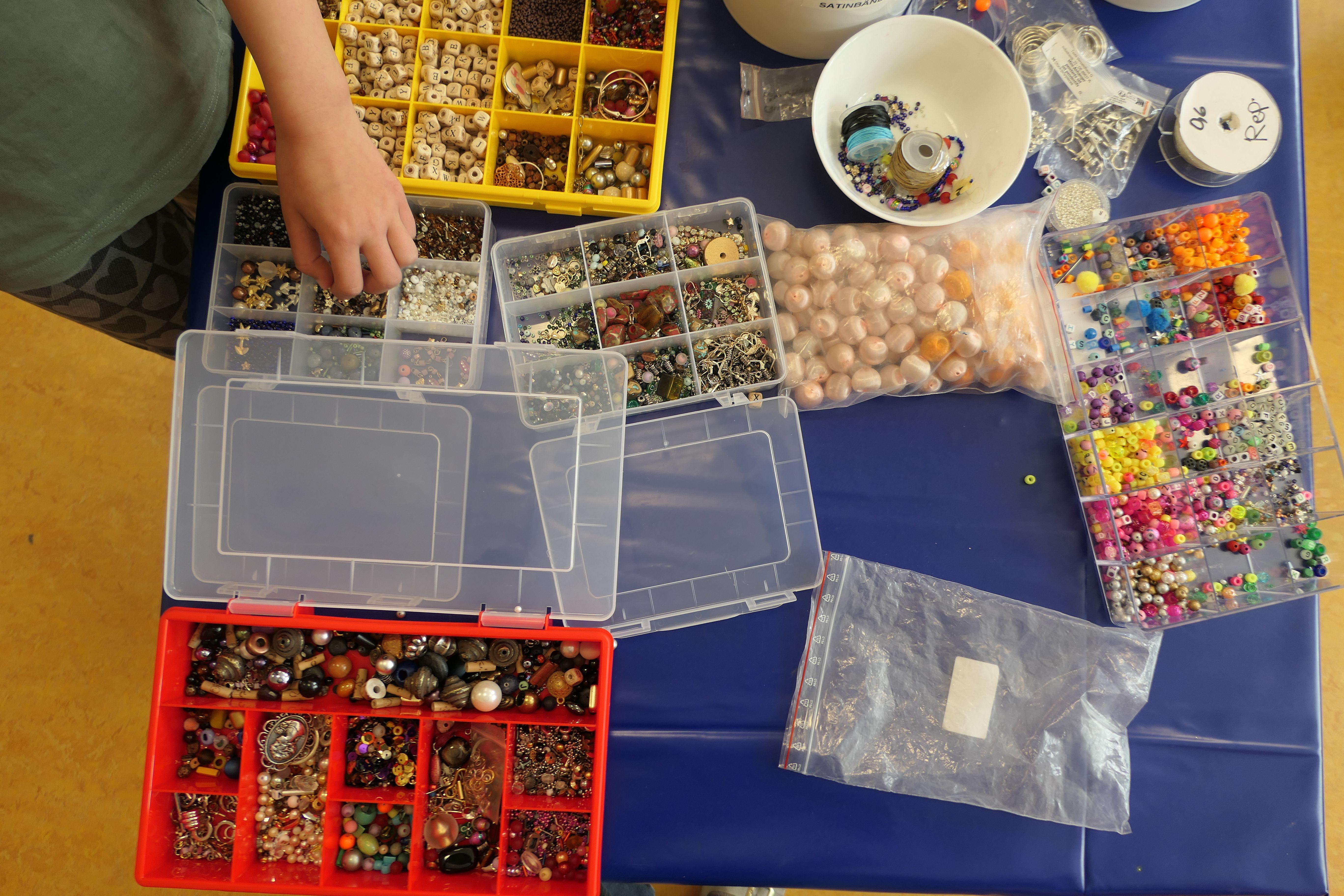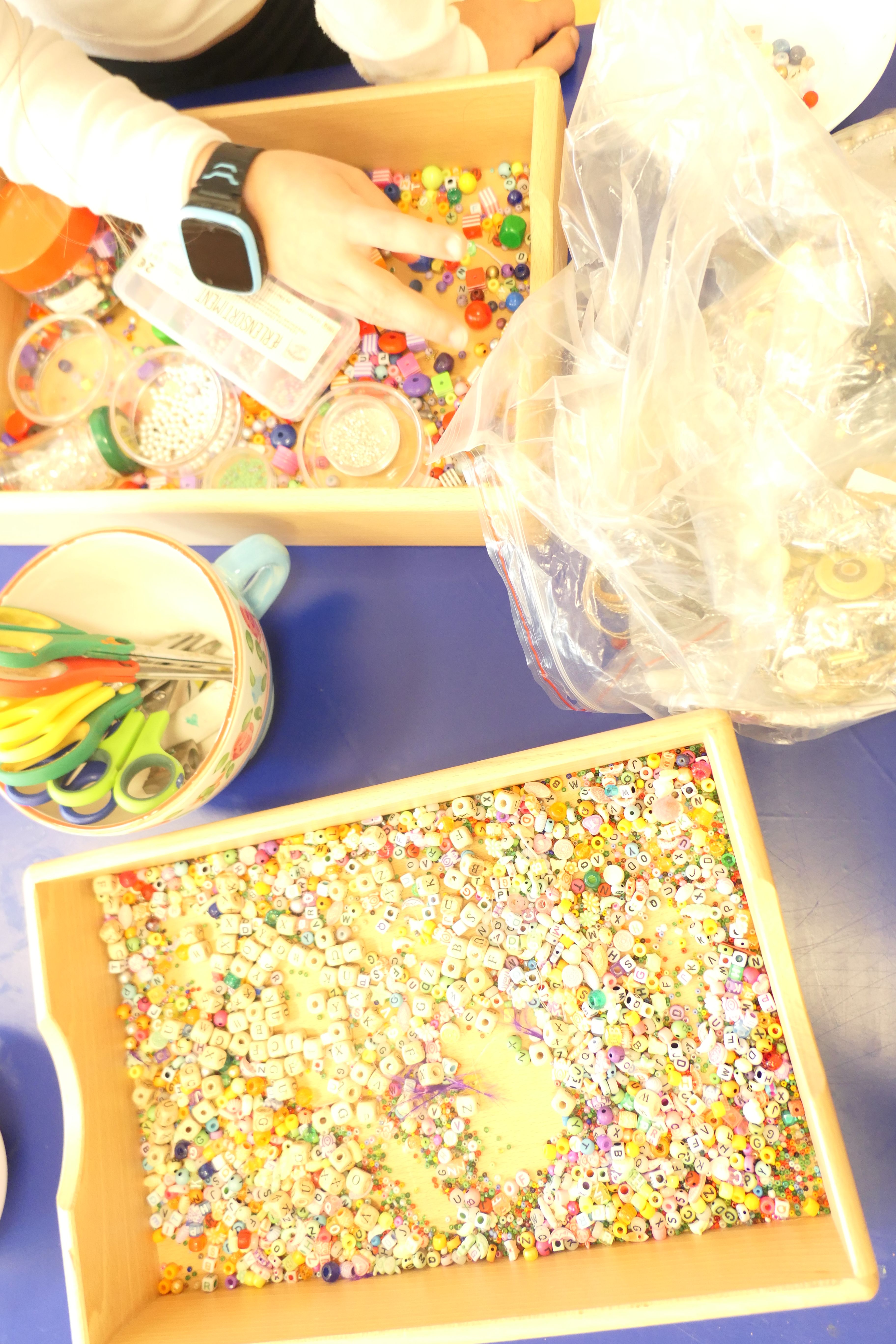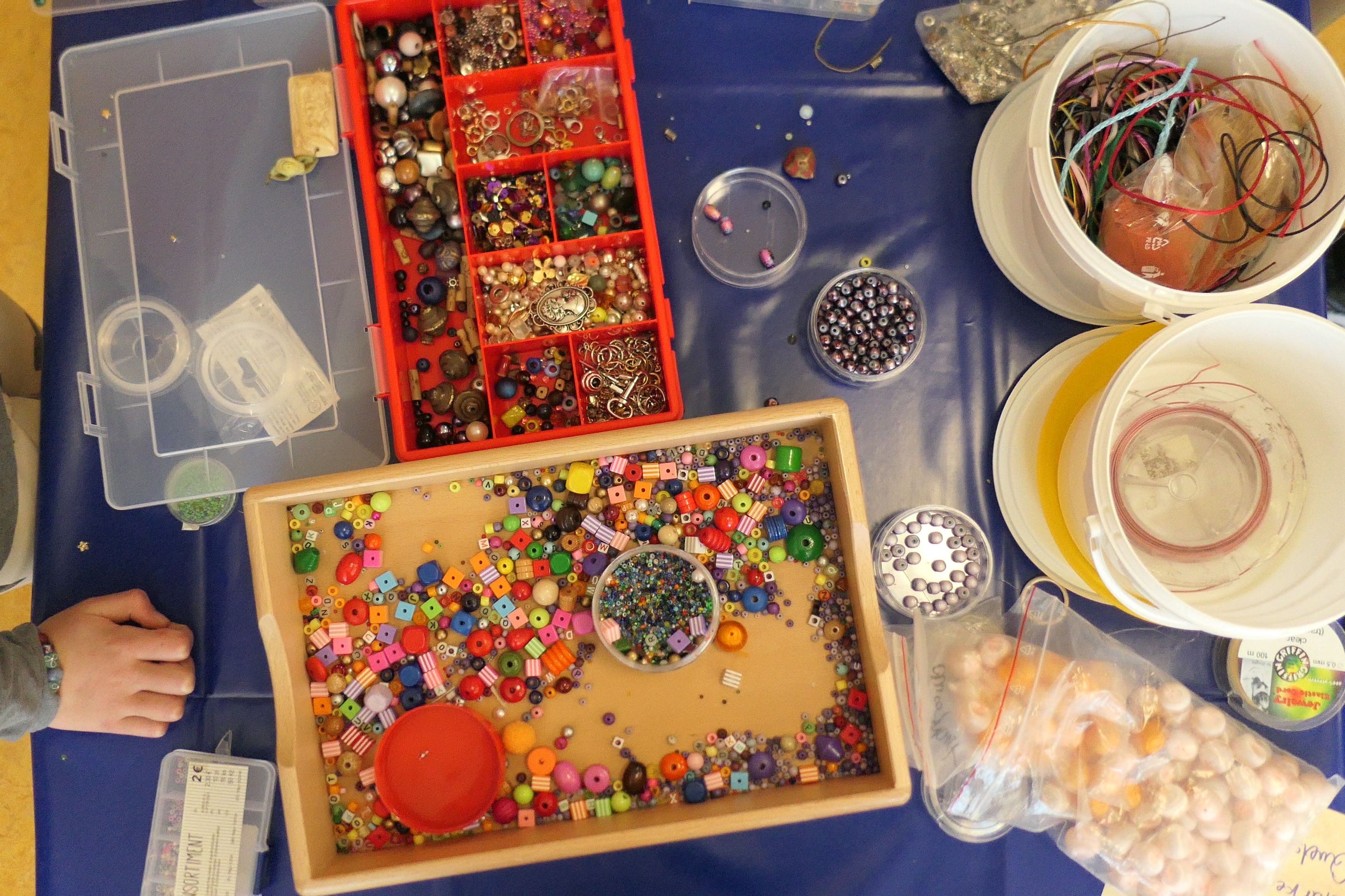Die Werkbänke waren gesäumt von einer schillernden Vielfalt an Materialien: vorgefertigte Gliederketten, Ohrringrohlinge, Seidenperlen, Glasperlen und eine Auswahl an kleinen Anhängern. Mit strahlenden Augen und einer gehörigen Portion Neugier stürzten sich die kleinen Künstlerinnen und Künstler in die Welt der Perlenkunst.