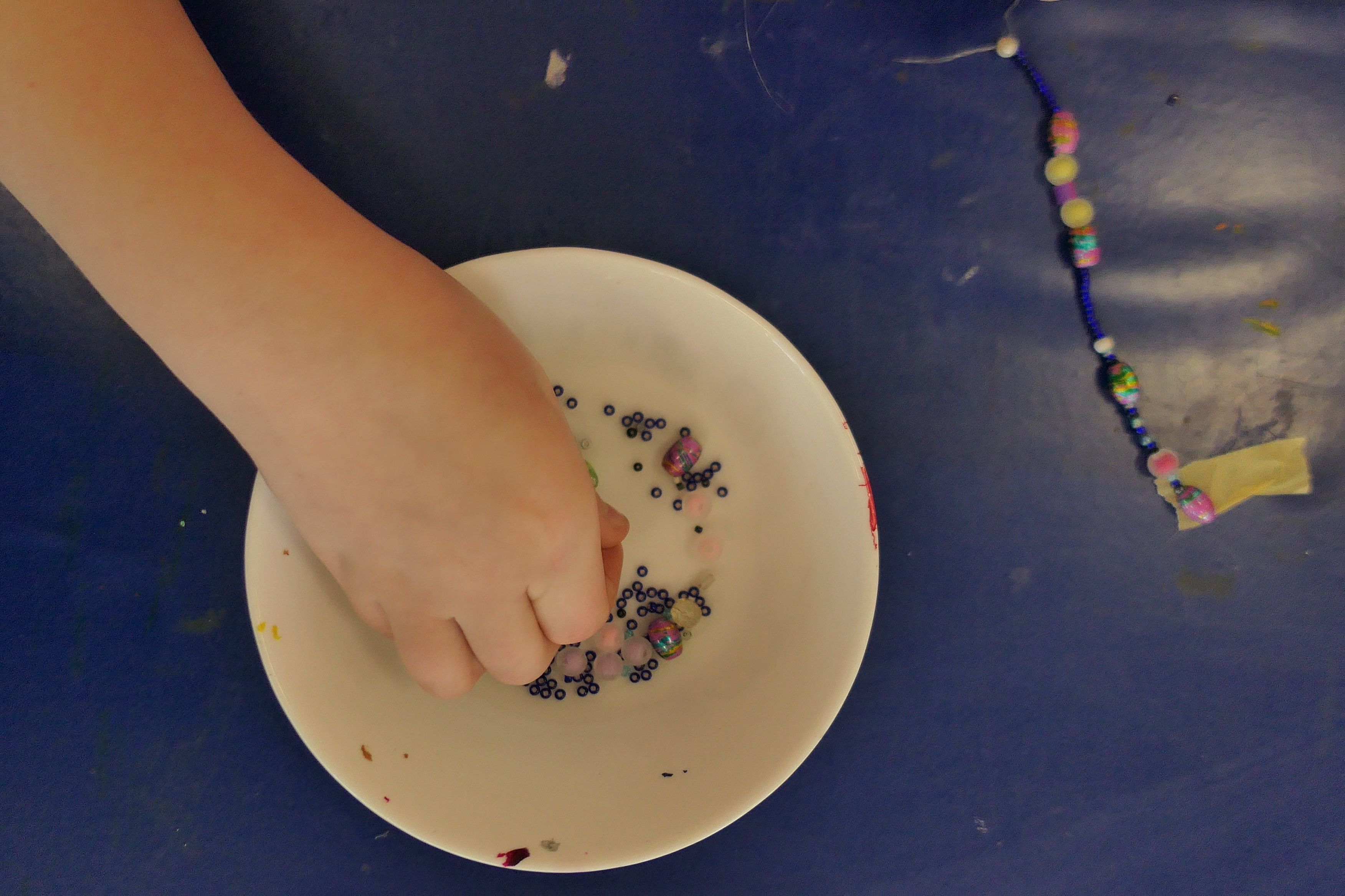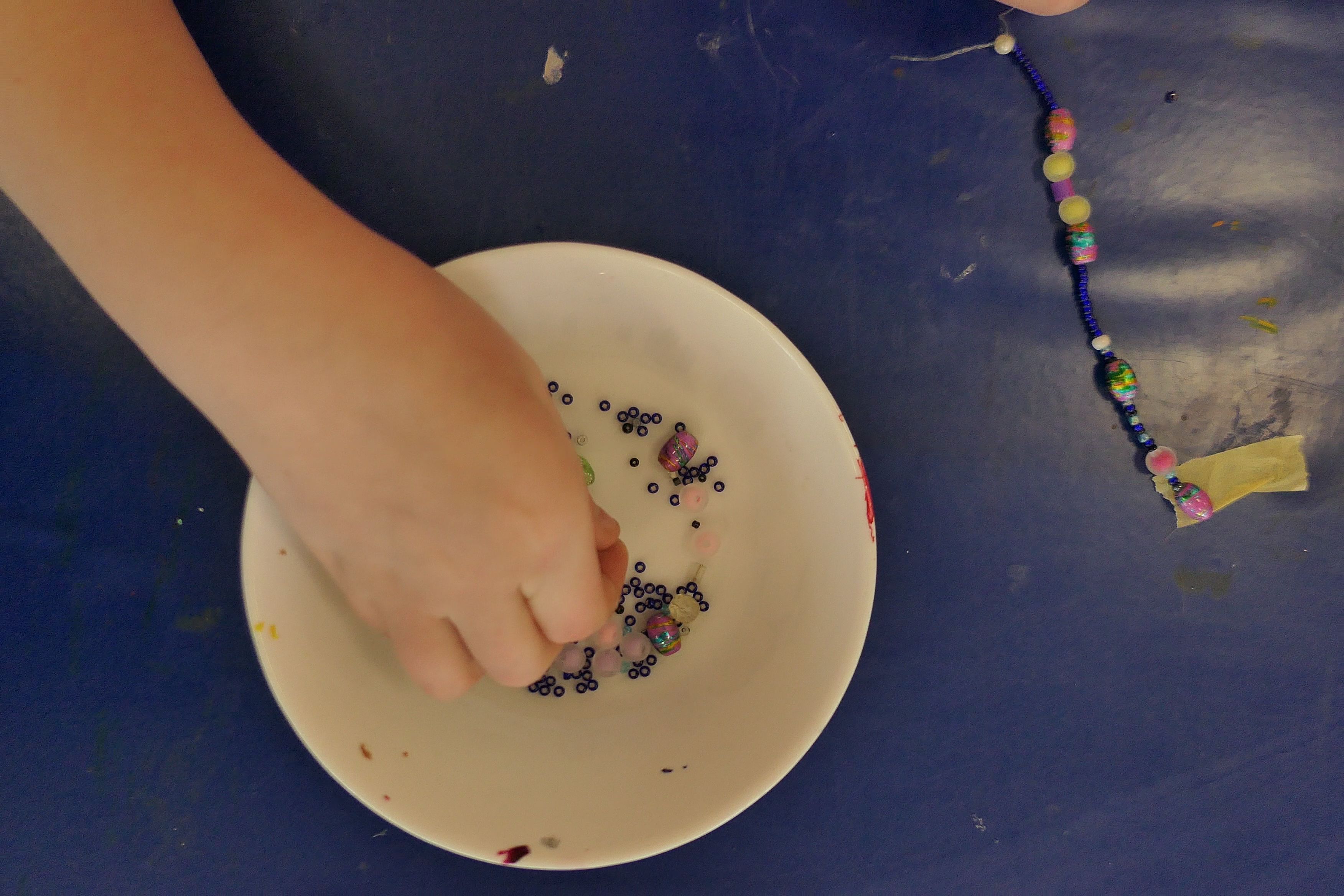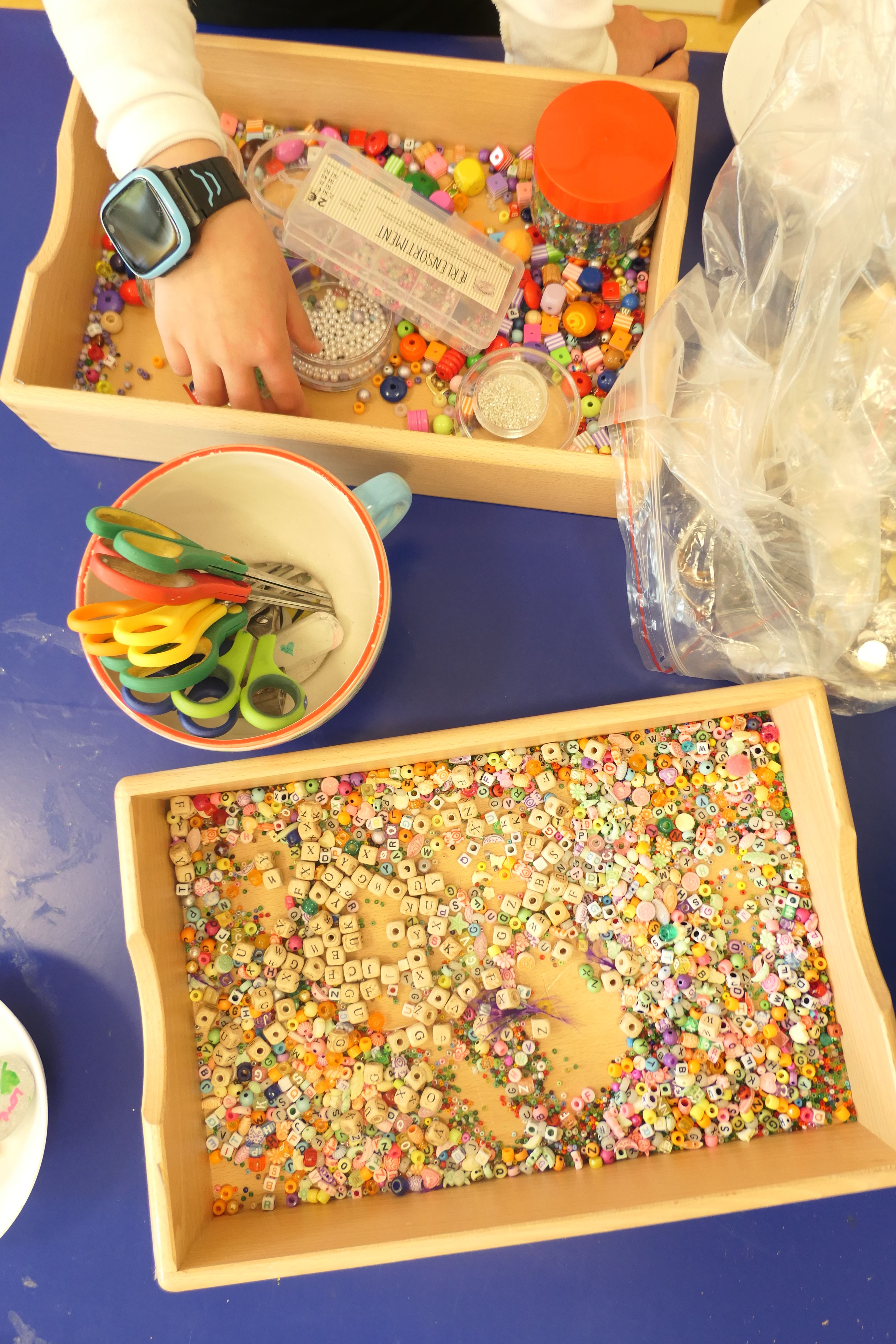 Die Werkbänke waren gesäumt von einer schillernden Vielfalt an Materialien: vorgefertigte Gliederketten, Ohrringrohlinge, Seidenperlen, Glasperlen und eine Auswahl an kleinen Anhängern. Mit strahlenden Augen und einer gehörigen Portion Neugier stürzten sich die kleinen Künstlerinnen und Künstler in die Welt der Perlenkunst.
