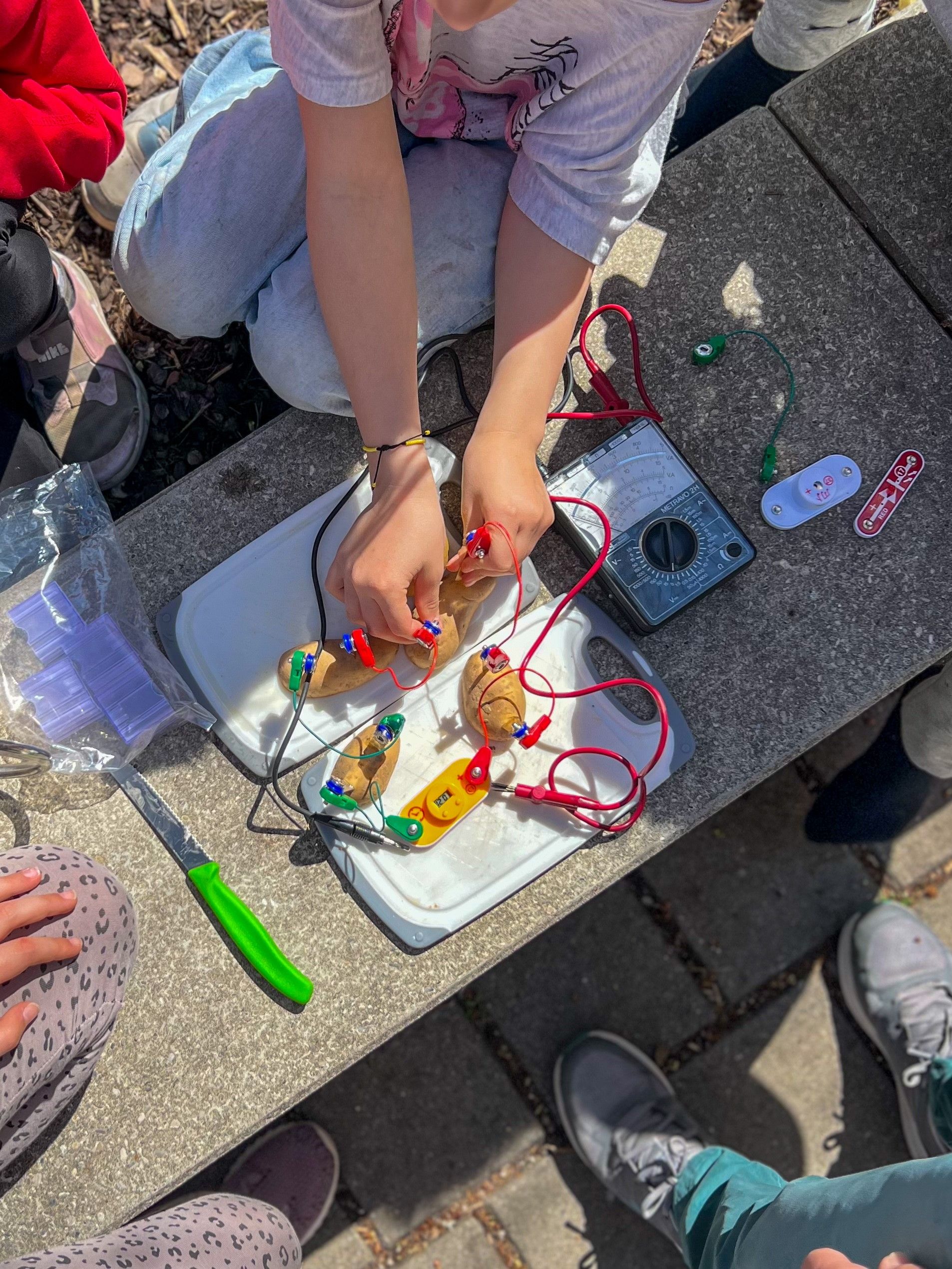 Kartoffeln und Zitronen können Strom erzeugen! Steckt man ein Stück Zink und Kupfer hinein, entsteht durch eine chemische Reaktion eine kleine Spannung. So kann man z. B. eine LED zum Leuchten bringen – ganz ohne Steckdose.