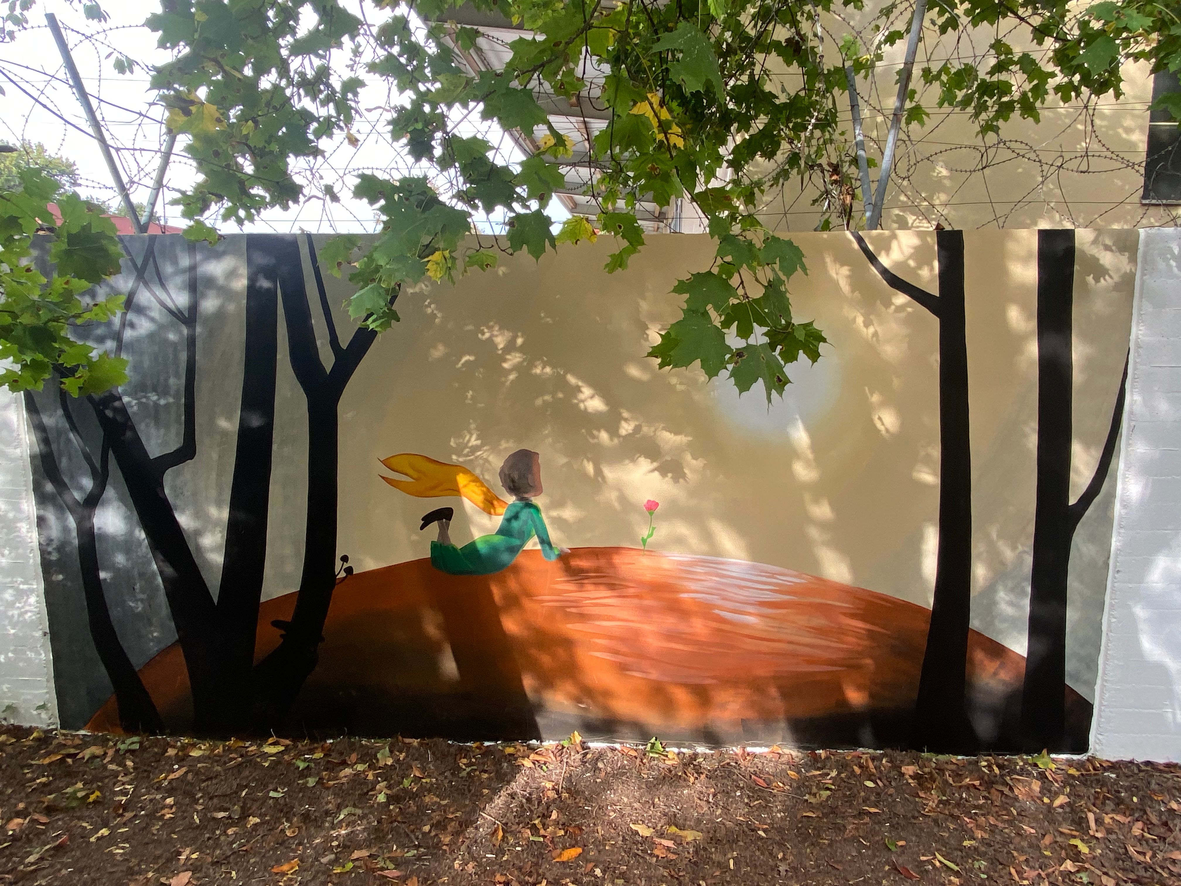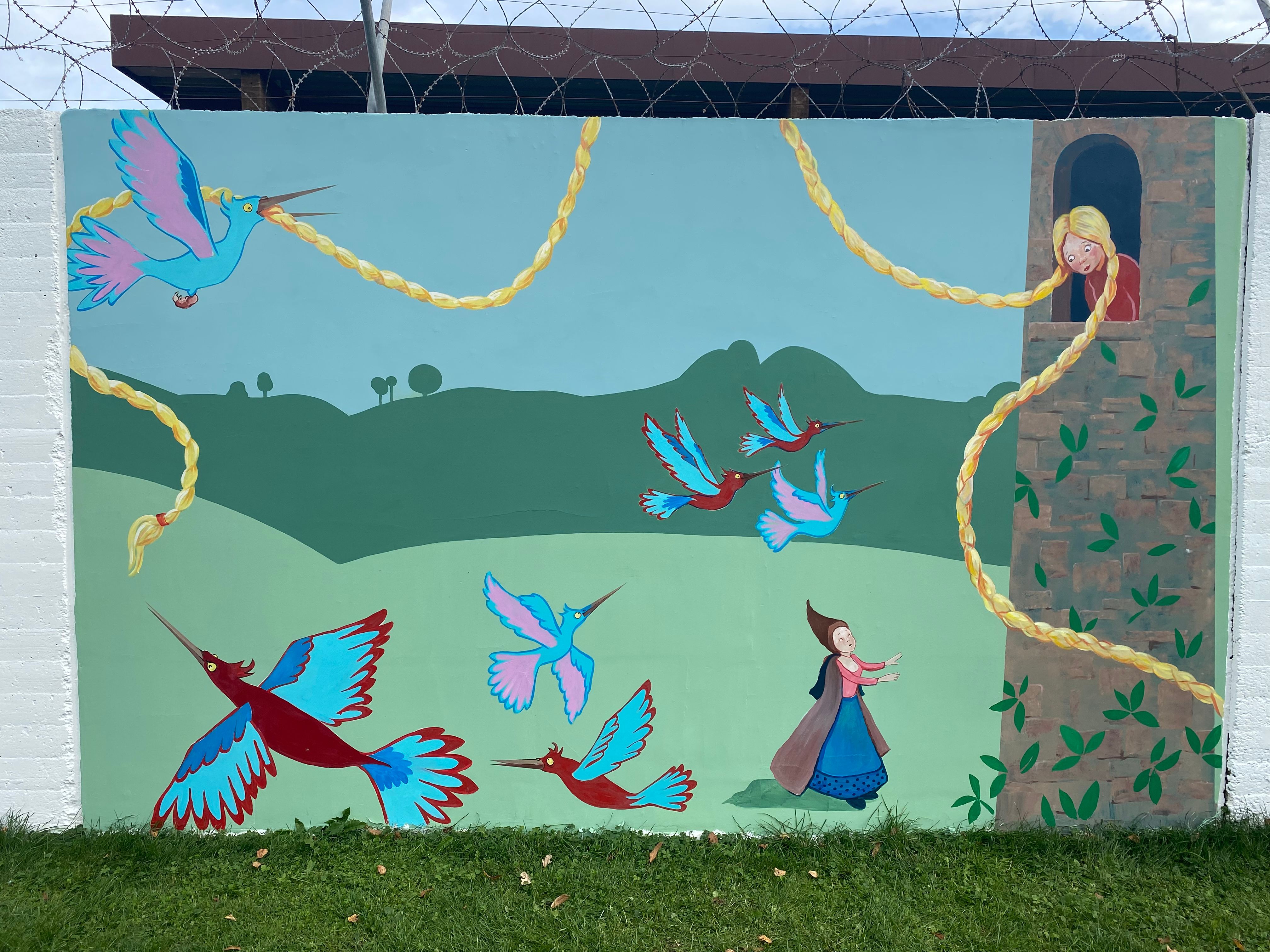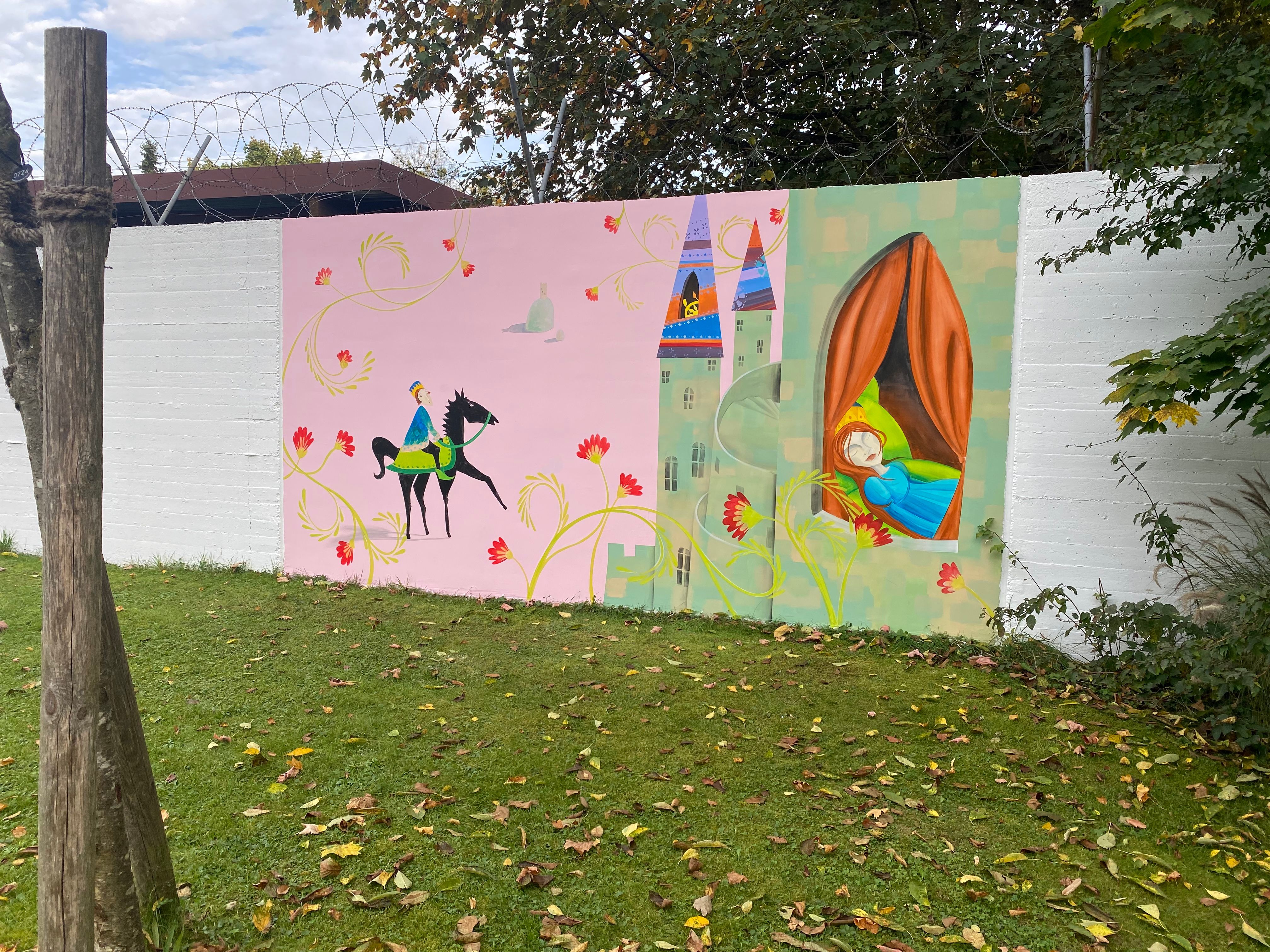 Viele Jahre wurde der erste Eindruck der Mäuseburg Krippe und Kindergarten durch eine sehr lange, graue Mauer mit Stacheldraht beeinflusst. Nun endlich bekamen wir die Genehmigung unsere Mauer im Garten der Krippe und des Kindergartens kinderfreundlich umzugestalten. Gemeinsam mit Herrn Birkle von unserer Gemeinde haben wir geplant unsere graue Mauer zu weißen und mit wetterfesten Märchenmotiven zu schmücken. Das Team um den Künstler Rene Buettner setzte unsere ausgewählten Motive genau nach unseren Vorstellungen um. Unsere Krippen und Kindergarten Kinder, wie auch die Eltern und wir als Team der Mäuseburg sind mehr als glücklich über die Bilder, die uns nun jeden Tag begleiten.