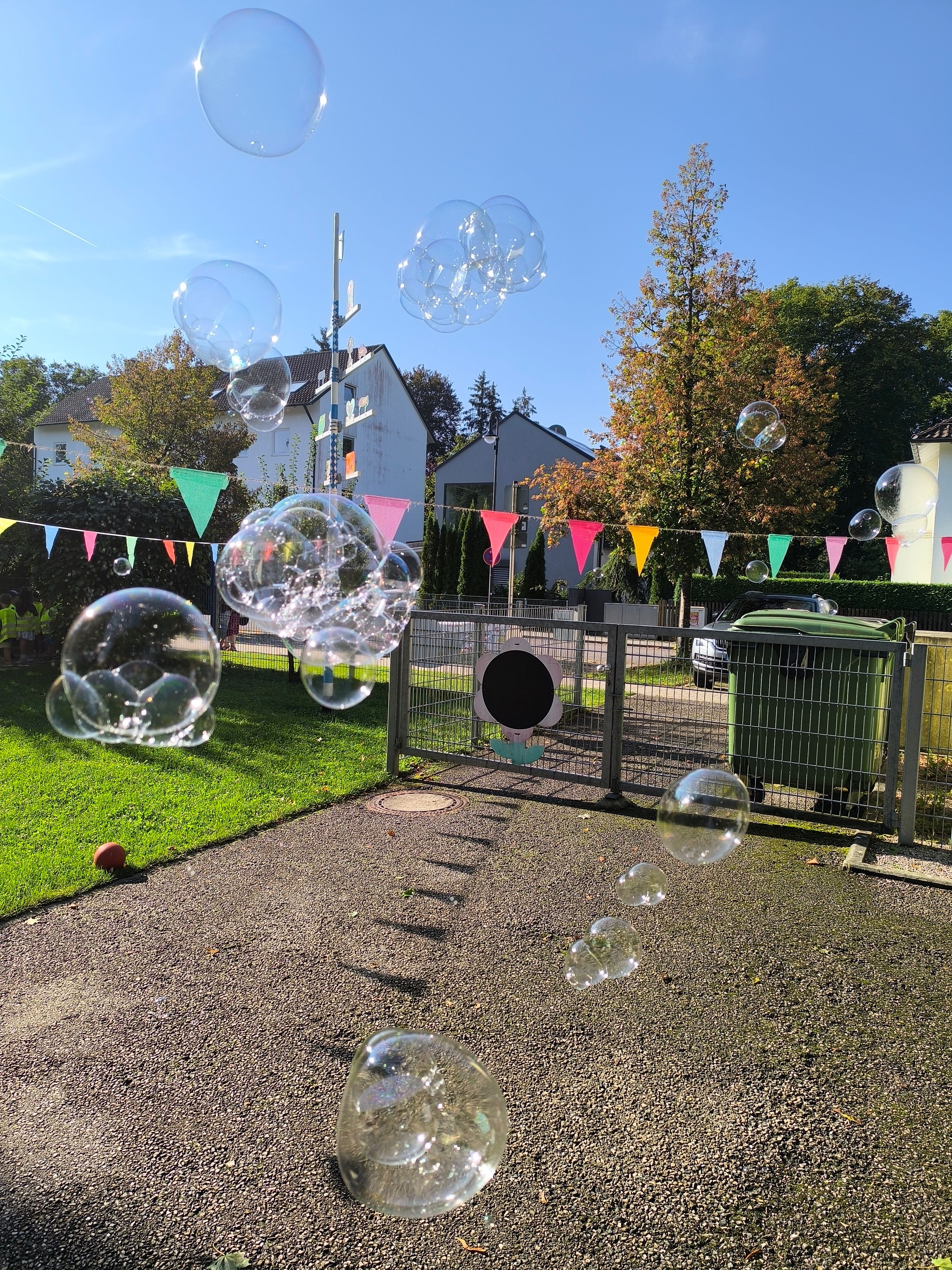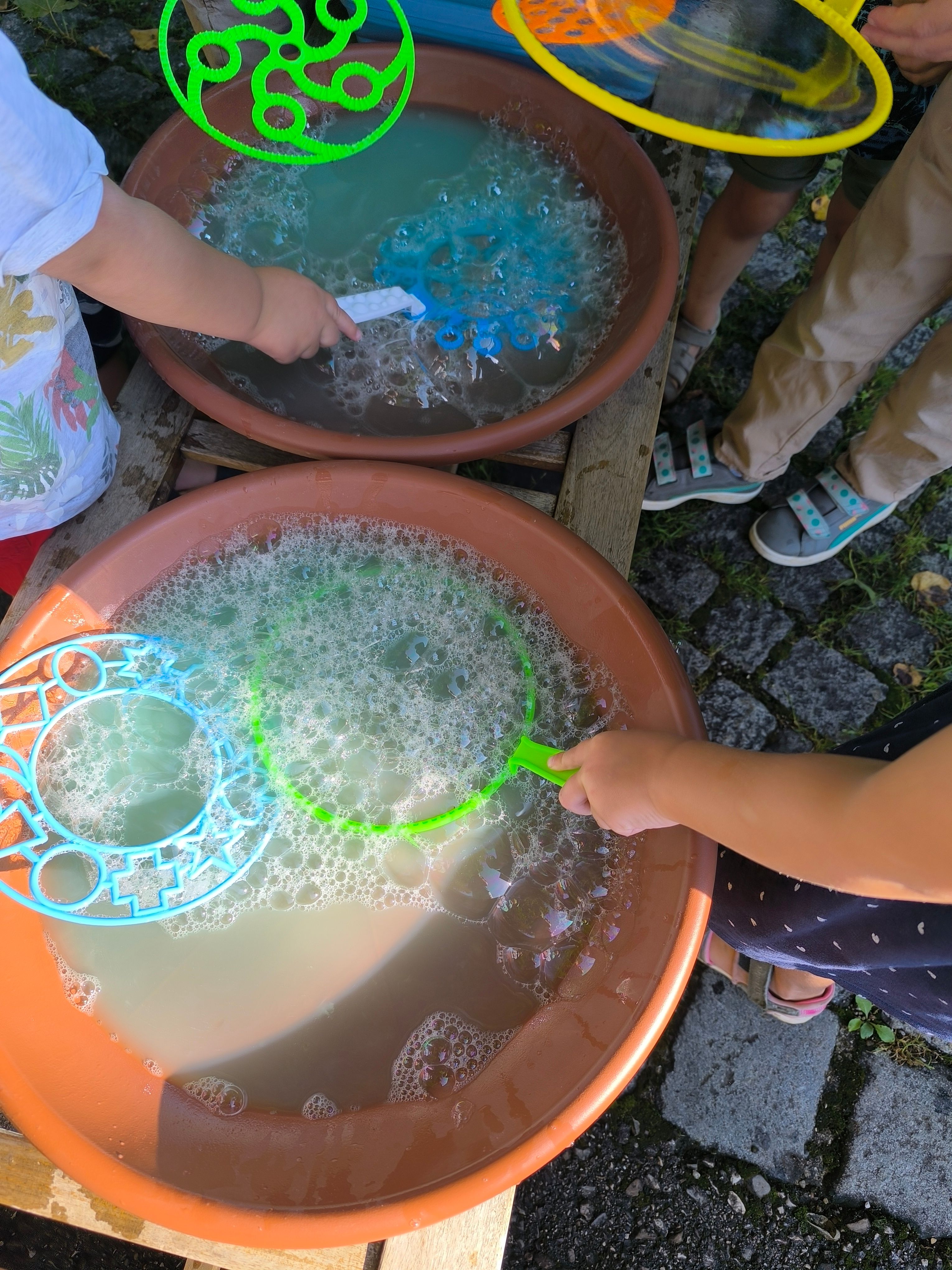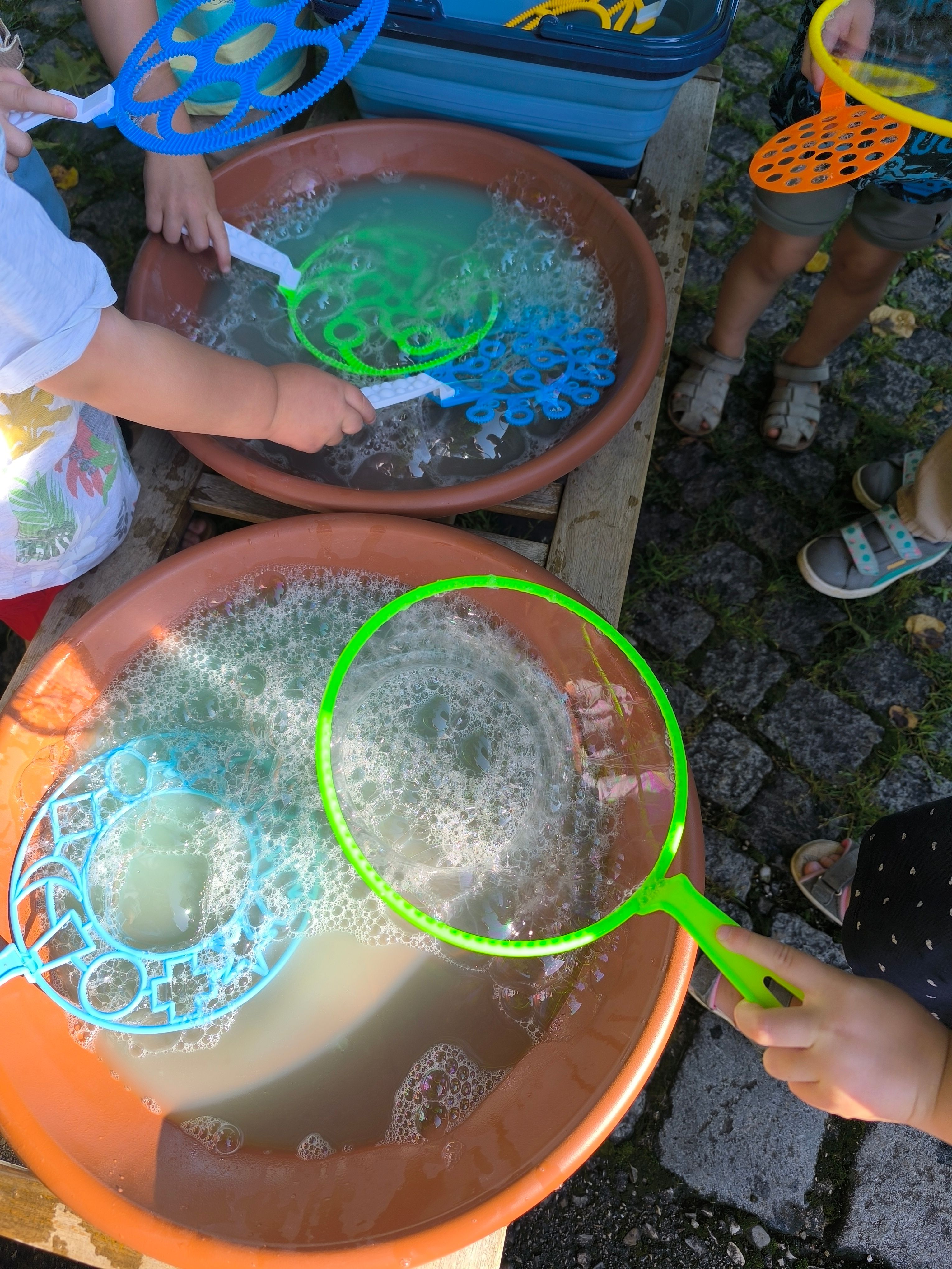 Auch in diesem Jahr freuen wir uns viele Krippenkinder neu im Kindergarten begrüßen zu dürfen. Die Eingewöhnungszeit ist mit vielen neuen Eindrücken und Emotionen bei den Kleinen verbunden. Die Umstellung vom großen Krippenkind zum kleinen Kindergartenkind möchten wir den Kindern so angenehm wie möglich gestalten. In diesem neuen Kindergartenjahr sind wir mit einer Eingewöhnungskinder- Seifenblasenparty gestartet. Das Wetter hat perfekt mitgespielt und die Kinder waren begeistert von den bunt glänzenden Seifenblasen.