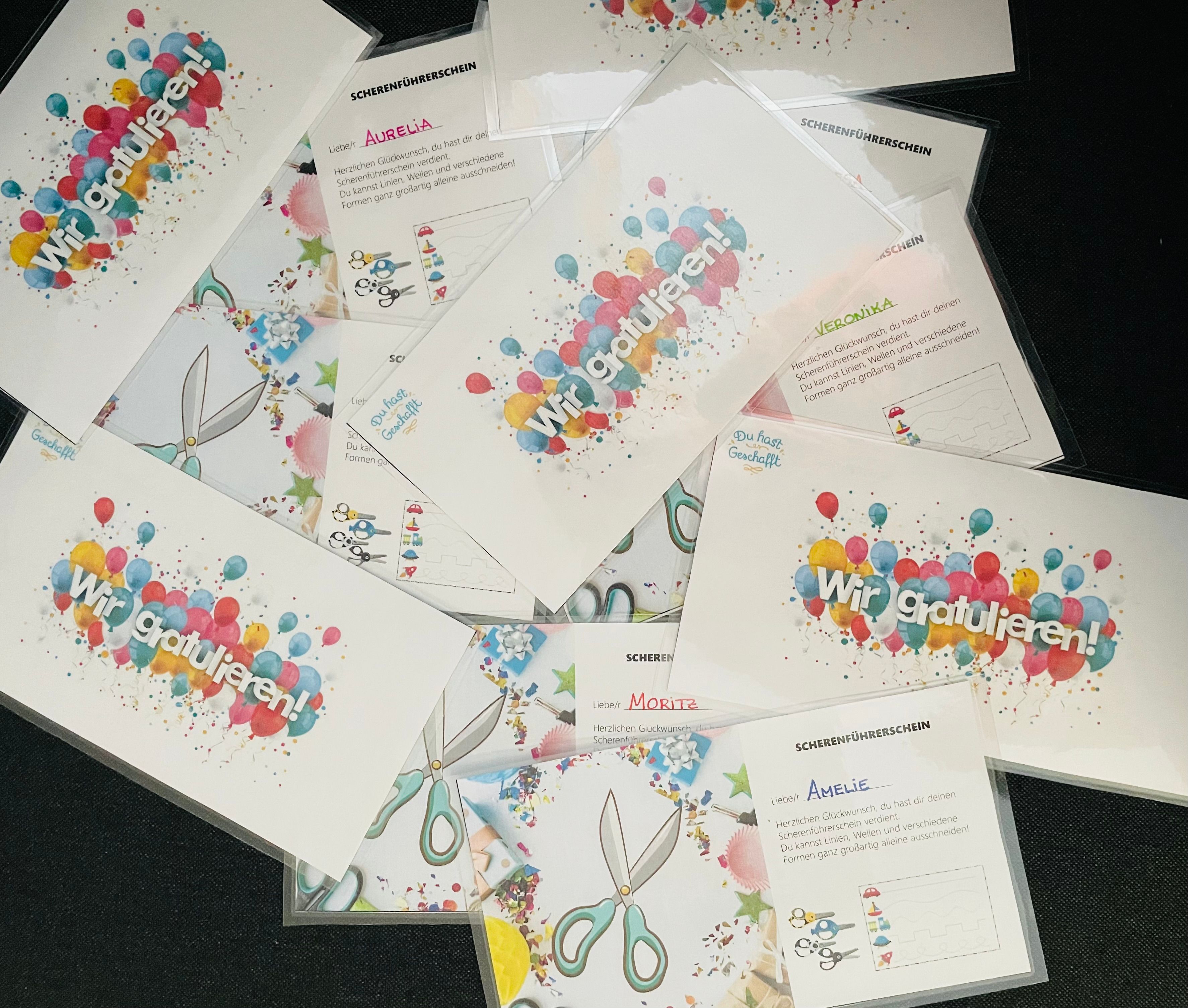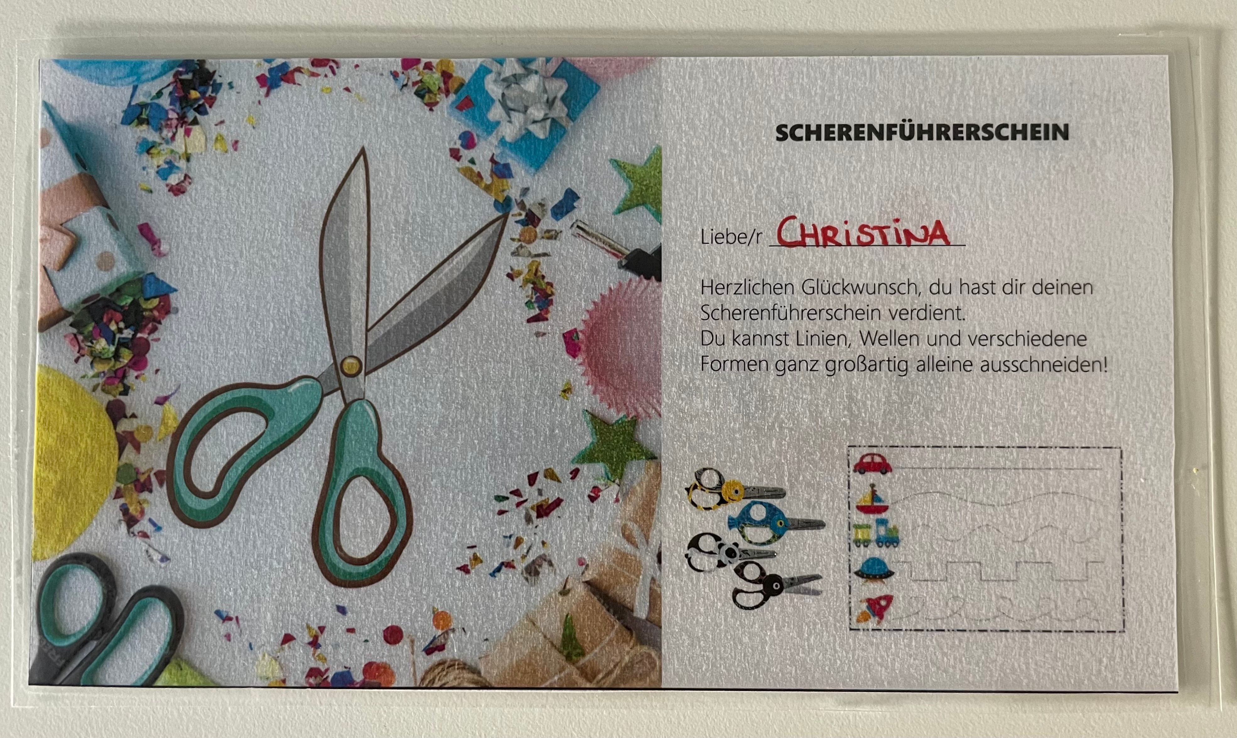 Unsere 12 Vorschulkinder haben verdient ihren Scherenführerschein bekommen. Jedes Kind hat gezeigt, dass es schon ganz großartig ALLEINE mit der Schere umgehen kann. Sie können gerade Linien, Wellen, Schlaufen und verschiedene Formen, wie z.Bsp.: Dreiecke oder Kreise ausschneiden. Wir freuen uns mit unseren Vorschulkindern. Ihr habt das ganz toll gemacht!