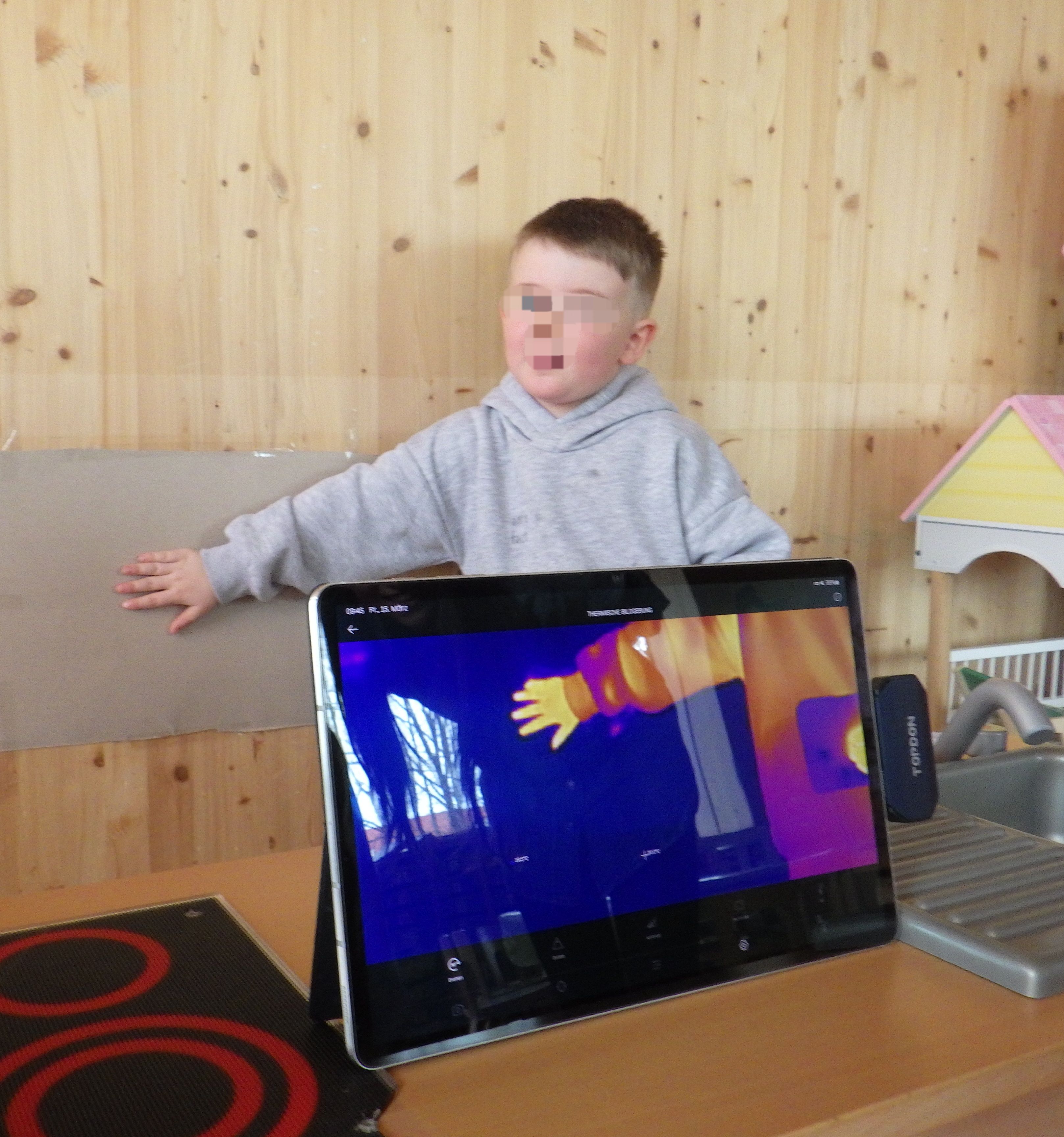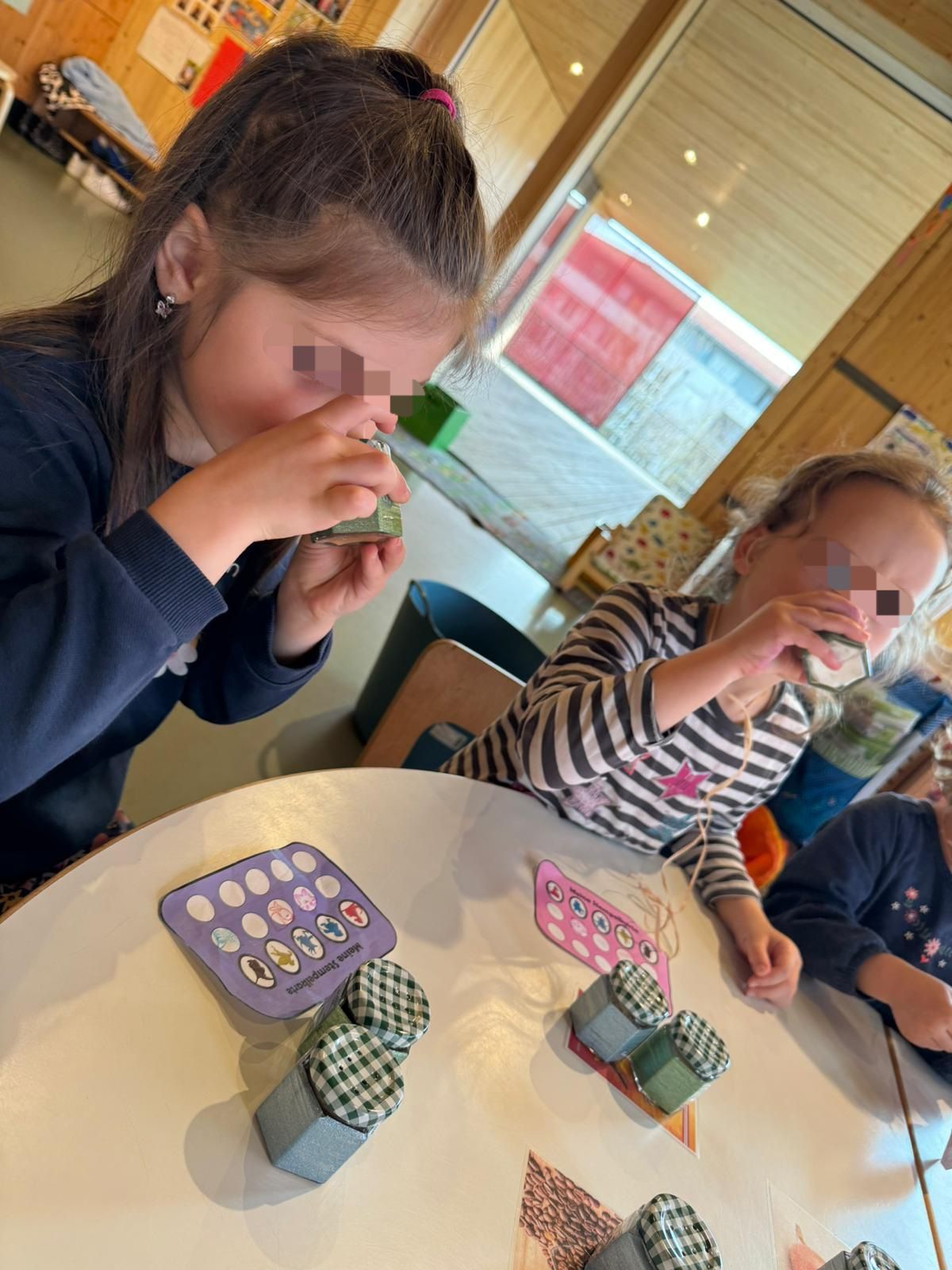 Zum Jahresthema “Unsere Sinne” konnten die Kindergartenkinder lernen, dass Farben bei unterschiedlichem Licht ganz anders erscheinen. Es gab Geräusche und Gerüche zu erkennen, optische Täuschungen anzusehen und die Möglichkeit einen Handabdruck an der Wand mit einer Wärmebildkamera sichtbar zu machen, obwohl das bloße Auge die Hand an der Wand schon nicht mehr sehen konnte. Die Kinder konnten ein einfaches Kaleidoskop aus einer Pappröhre und Klarsichtfolie basteln und haben verschiedene Oberflächen auf einem "Barfußparcours" gefühlt. Ausserdem konnten sie die Klänge von unterschiedlich gefüllten Gläsern anhören und vergleichen.