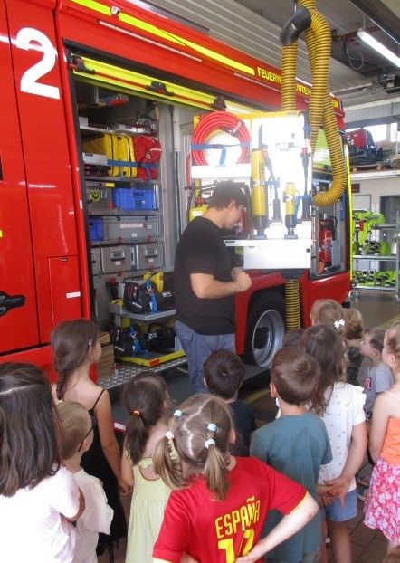 Dort erfuhren die Kinder all das, was eine Einsatzkraft der Feuerwehr so benötigt, um jegliche Gefahrensituation zu meistern. Einsatzkleidung, Fahrzeuge und Werkzeuge wurden unter die Lupe genommen und die Kinder durften sogar selbst aktiv werden und “löschen”.