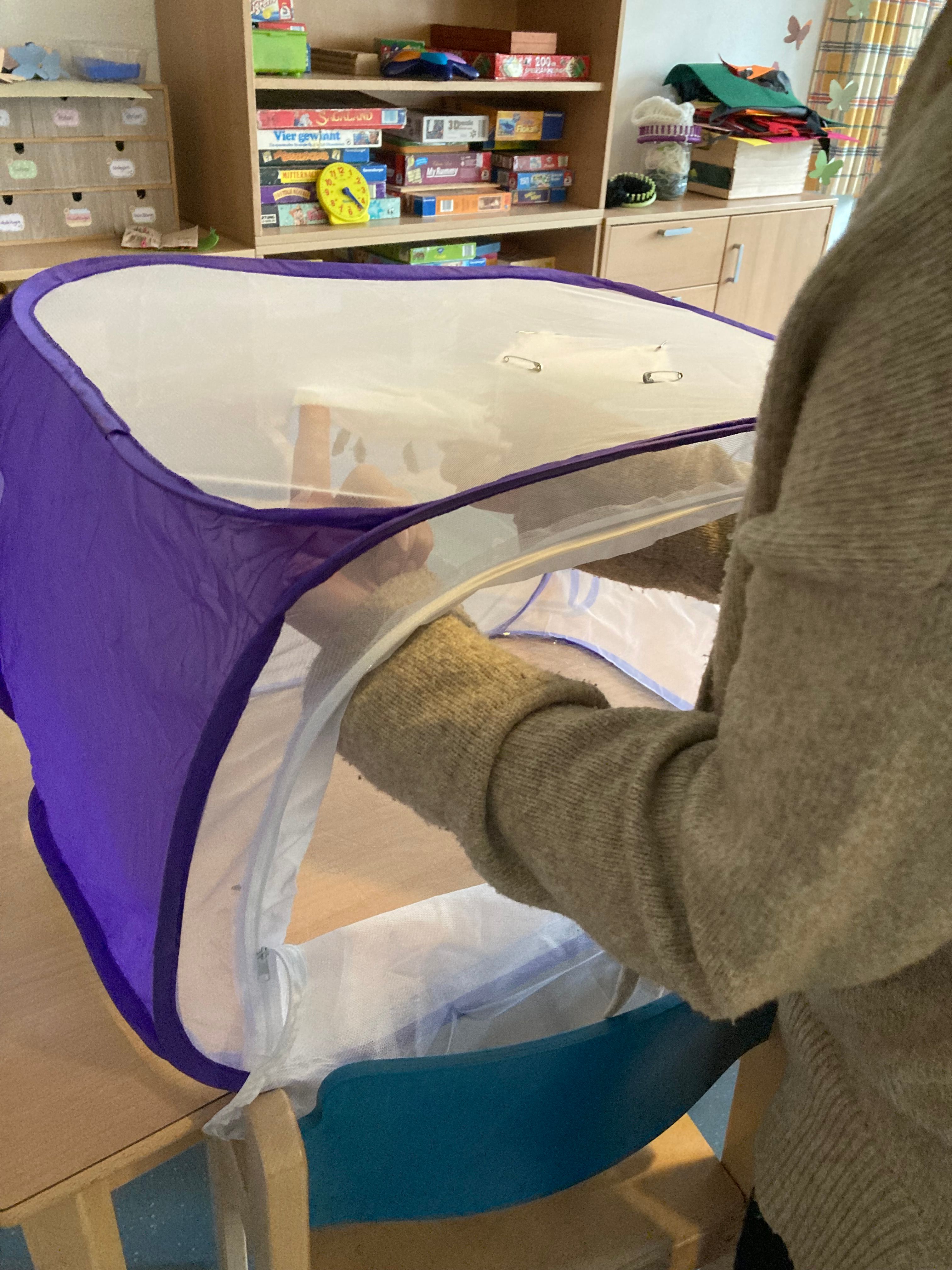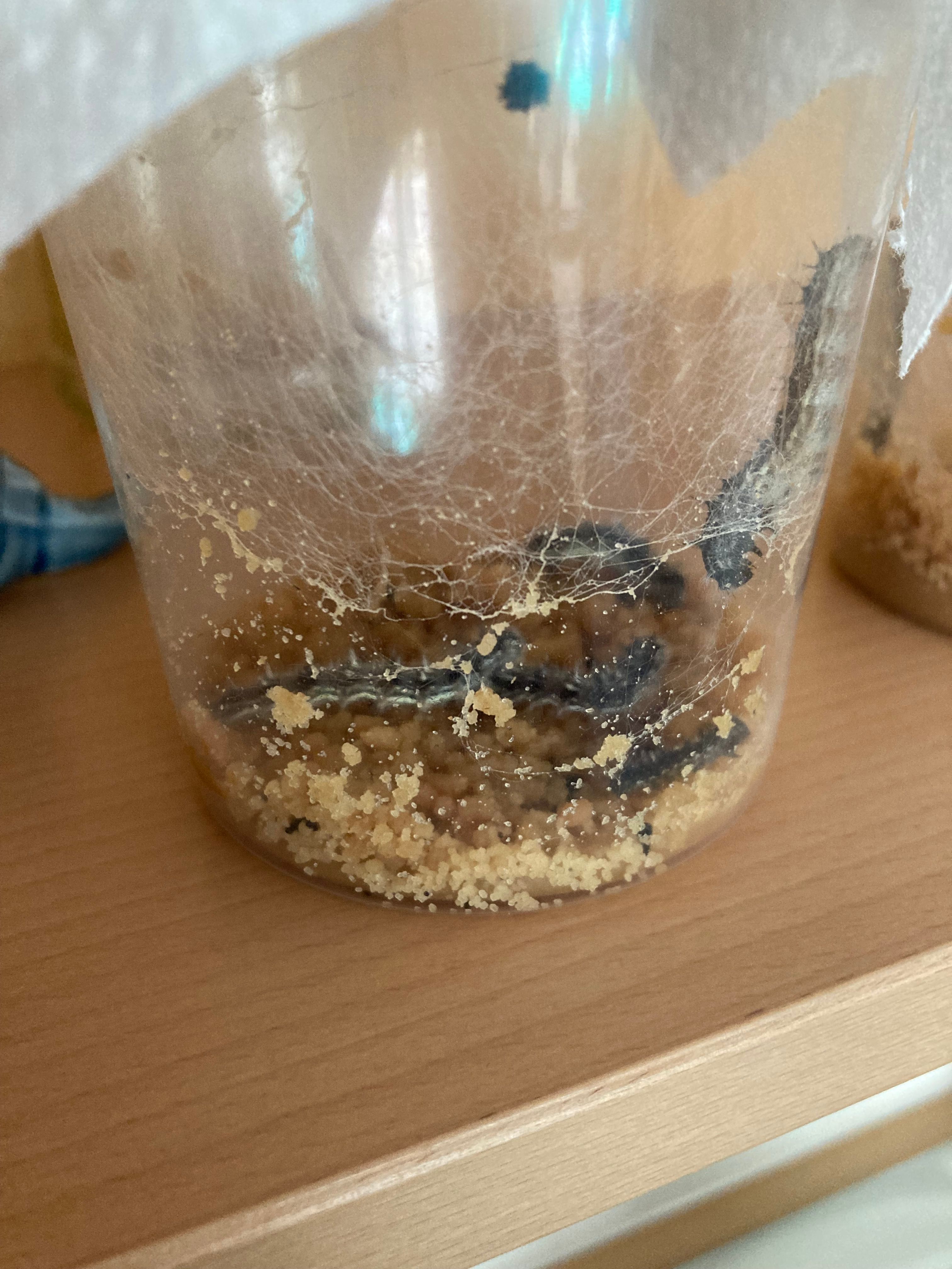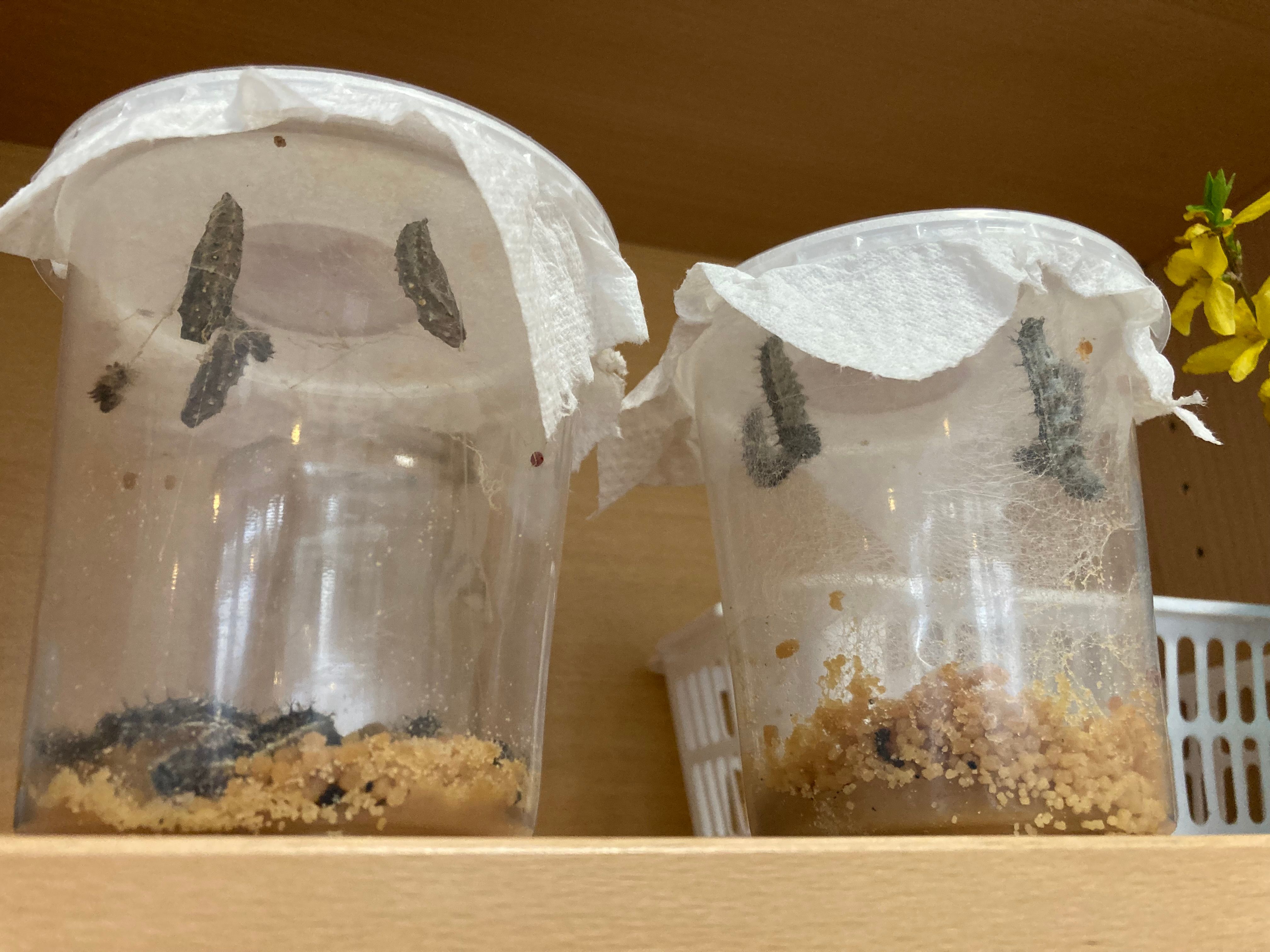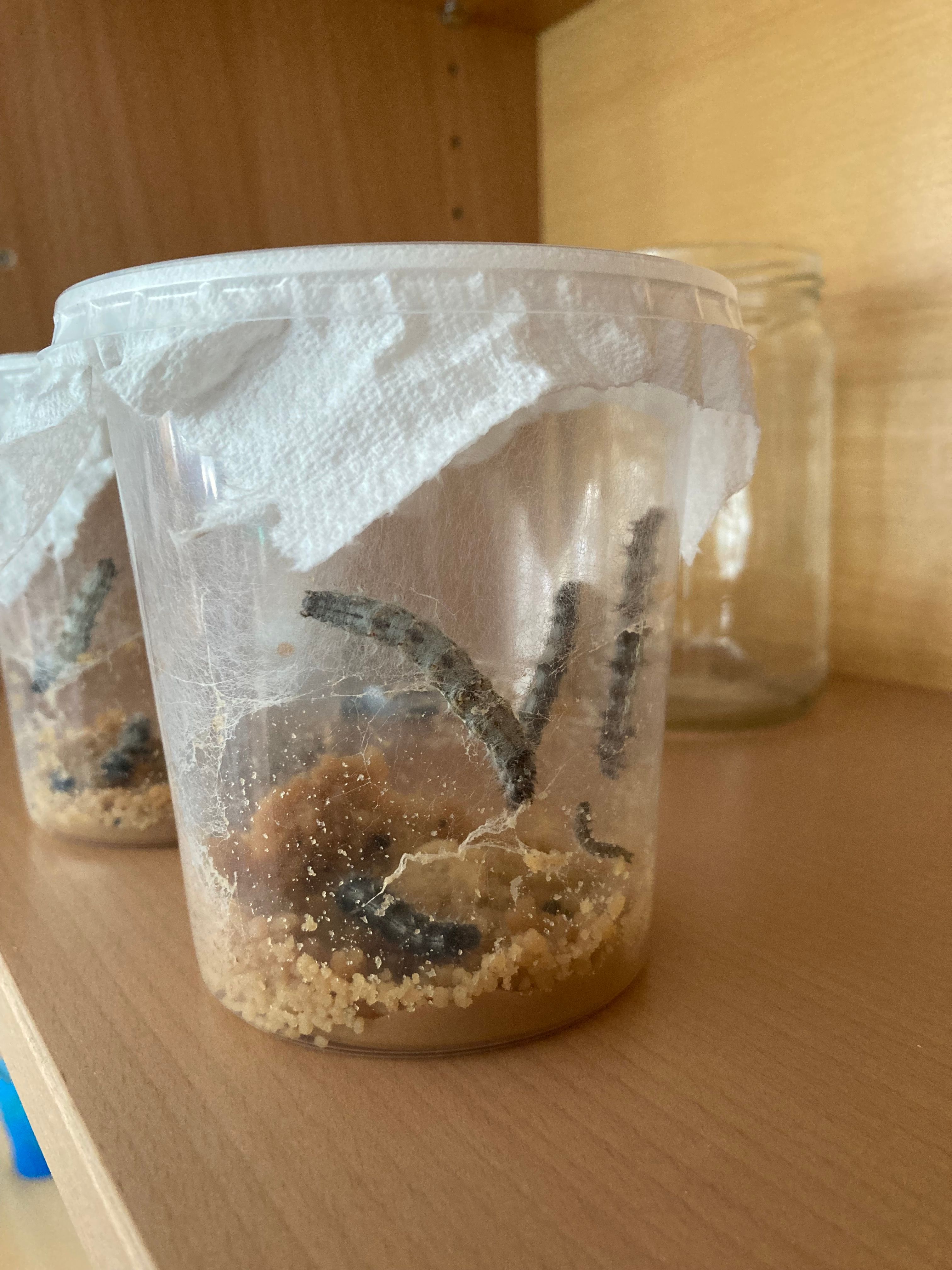 Angekommen sind die schönen Schmetterlinge bei uns in zwei Bechern als Larven. Über mehrere Wochen konnten wir dann beobachten, wie sie zu Raupen wurden, sich verpuppt haben und letztendlich geschlüpft und zu Schmetterlingen wurden!
