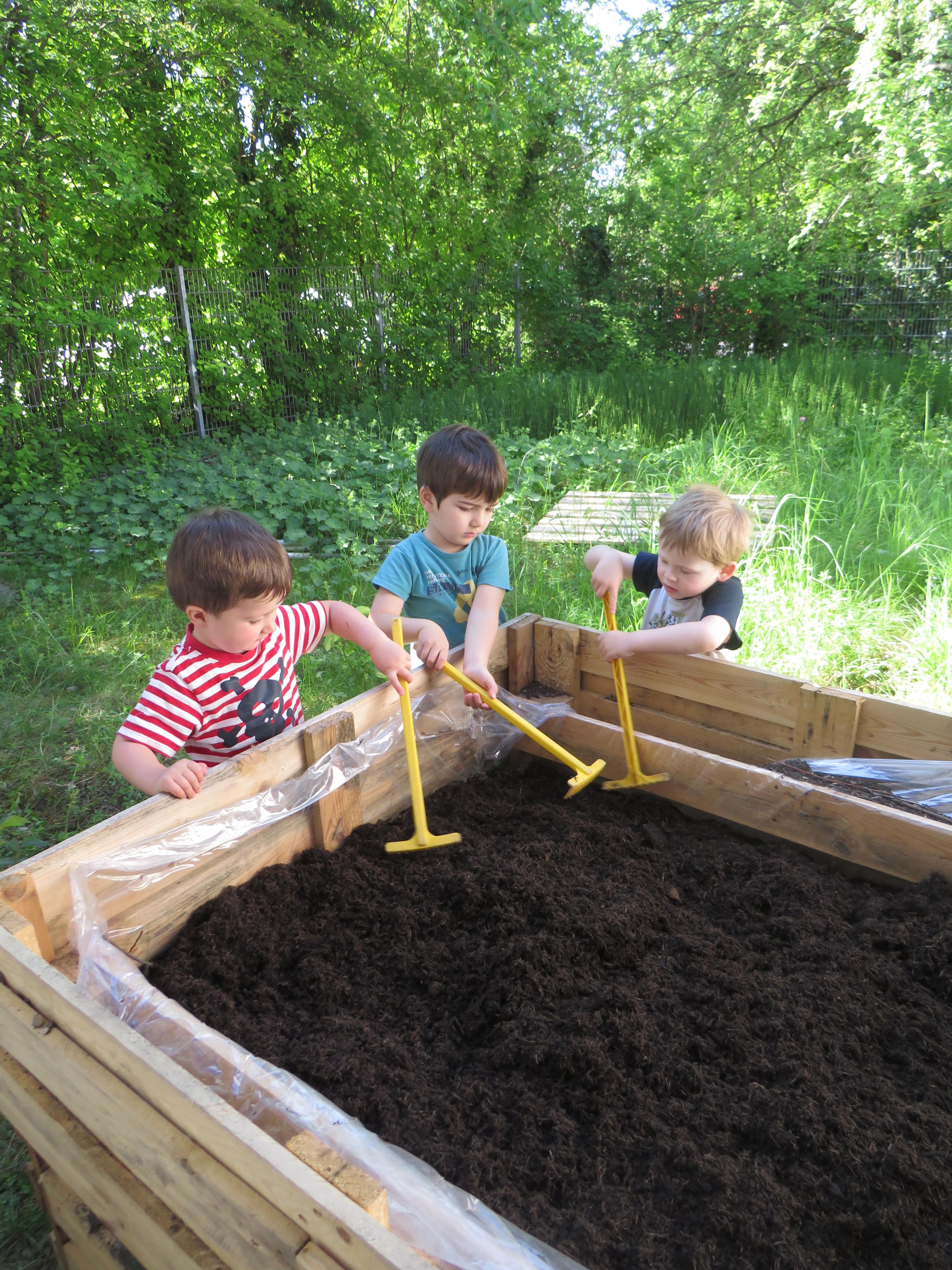 Zuerst erkunden wir den Boden. Bei Spaziergängen in der näheren Umgebung graben wir Löcher, nehmen Erdproben und erfahren was im Boden lebt. Bewegungsangebote wie Barfußparcours (drinnen und draußen), machen den Boden für die Kinder fühlbar.