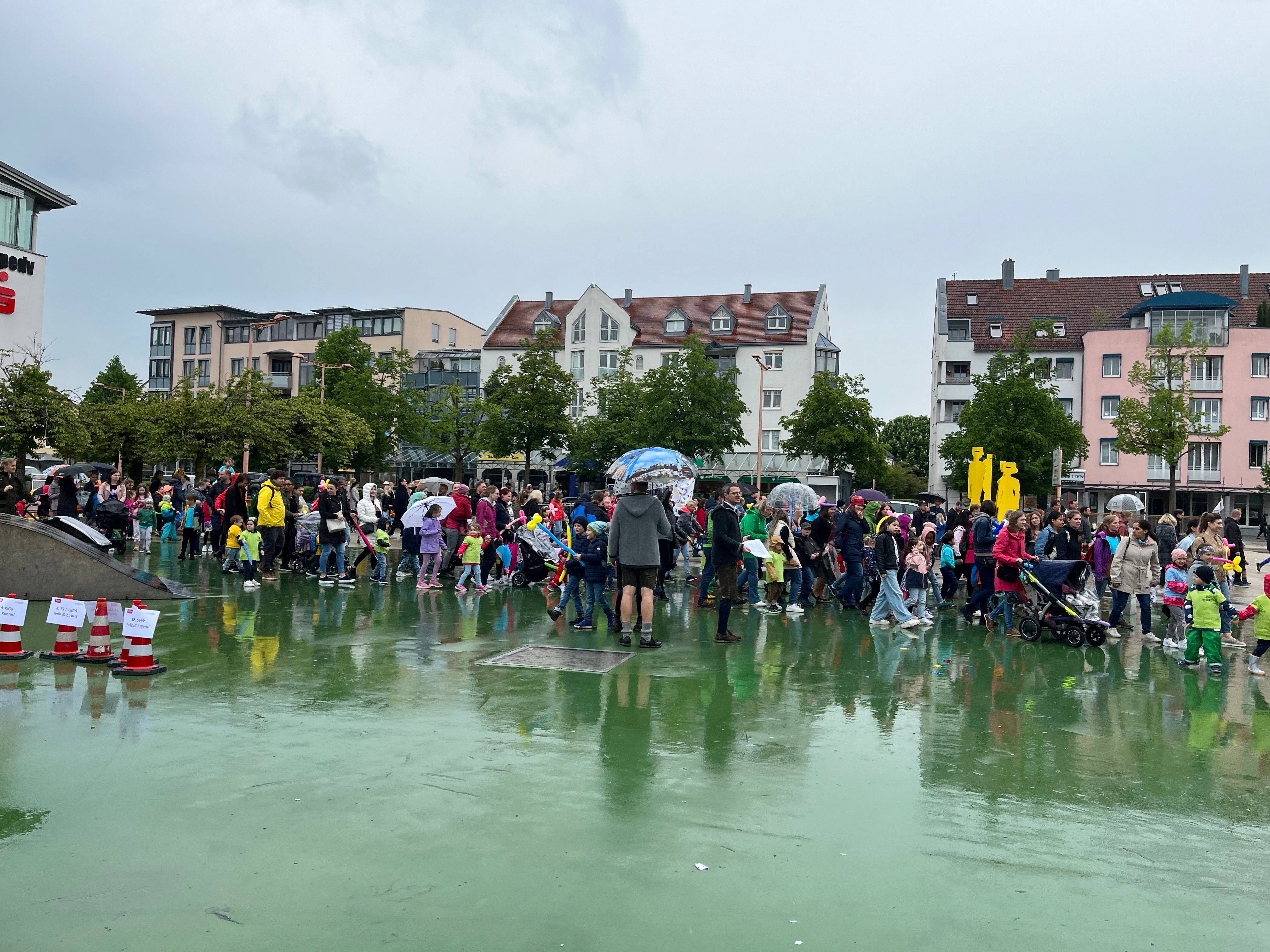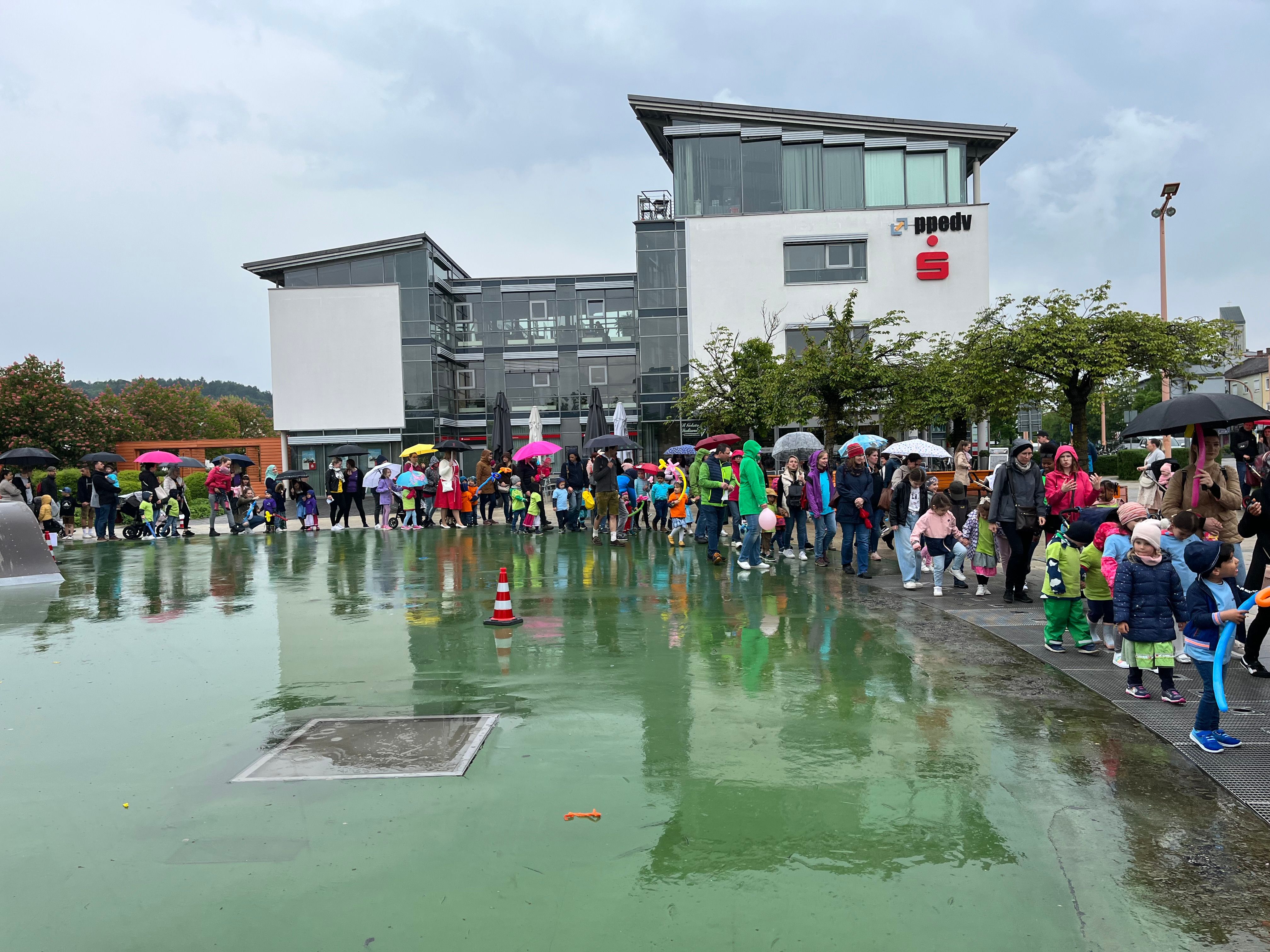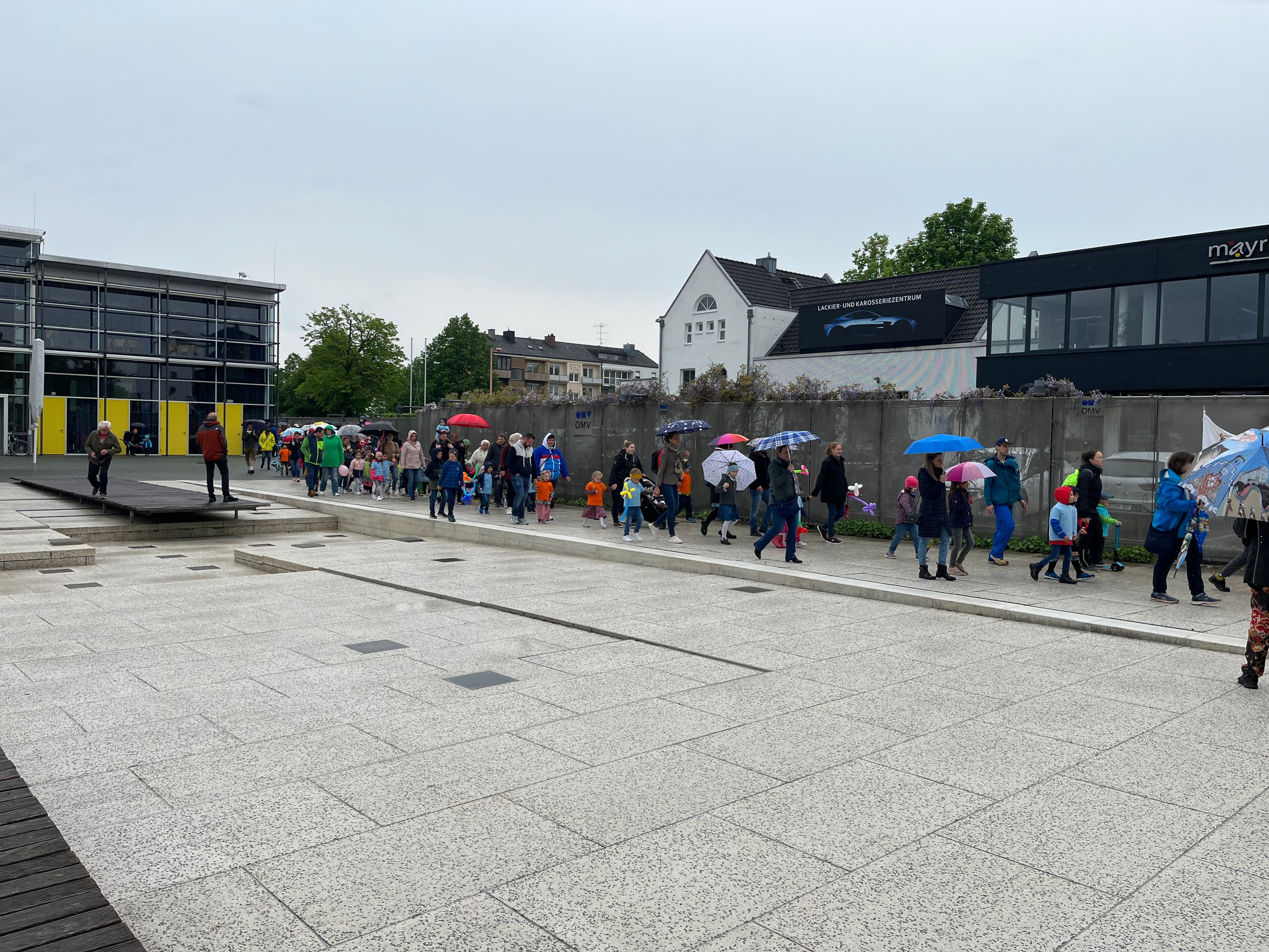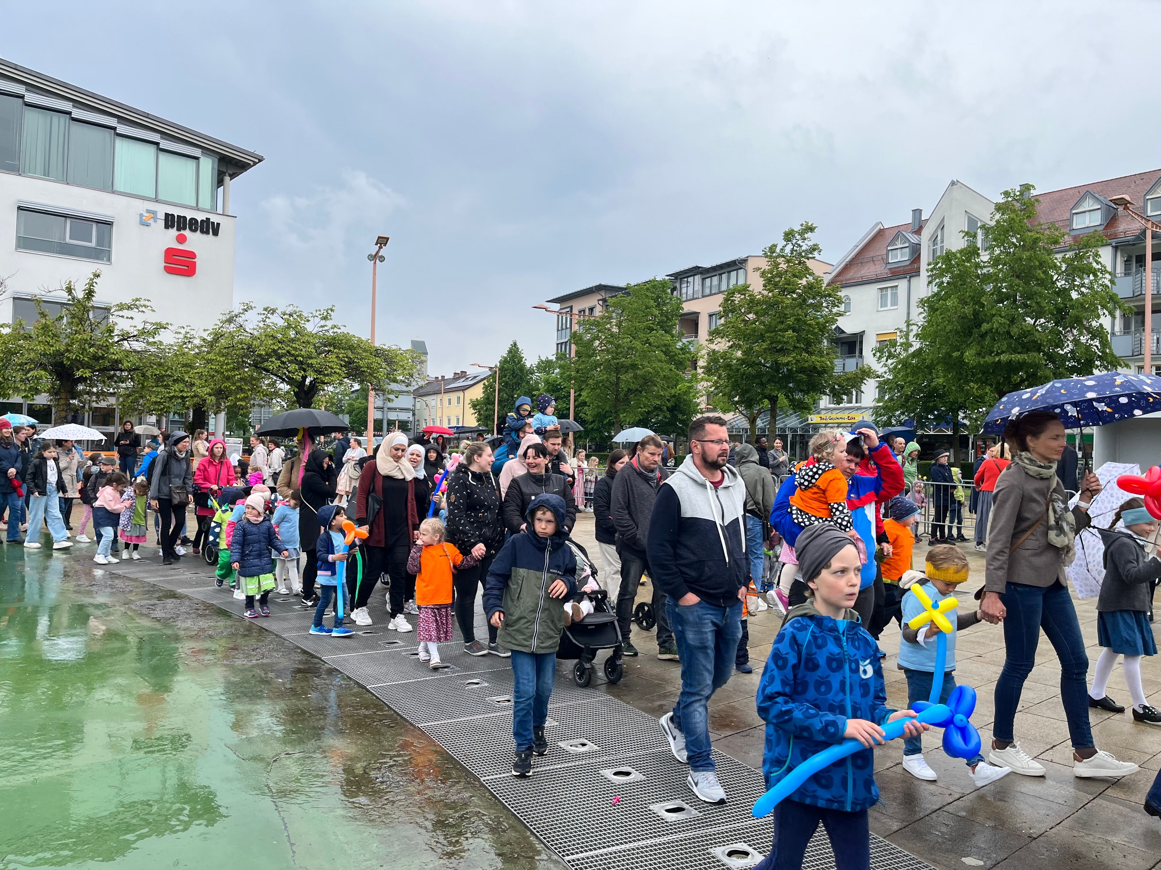 Als größte teilnehmende Gruppe mit 99 Kindern gingen wir gemeinsam mit den Familien bei regnerischem Wetter beim Umzug mit.