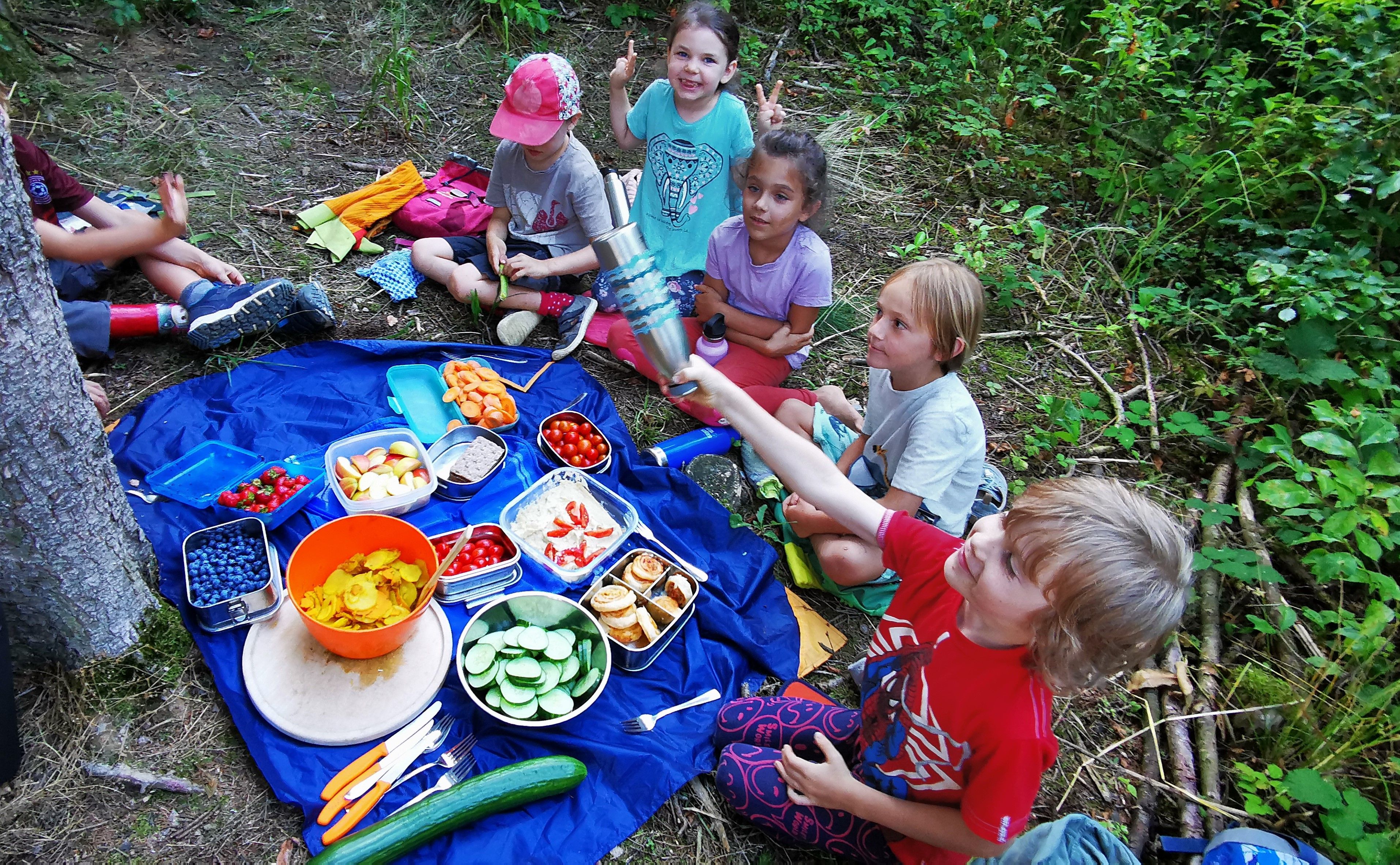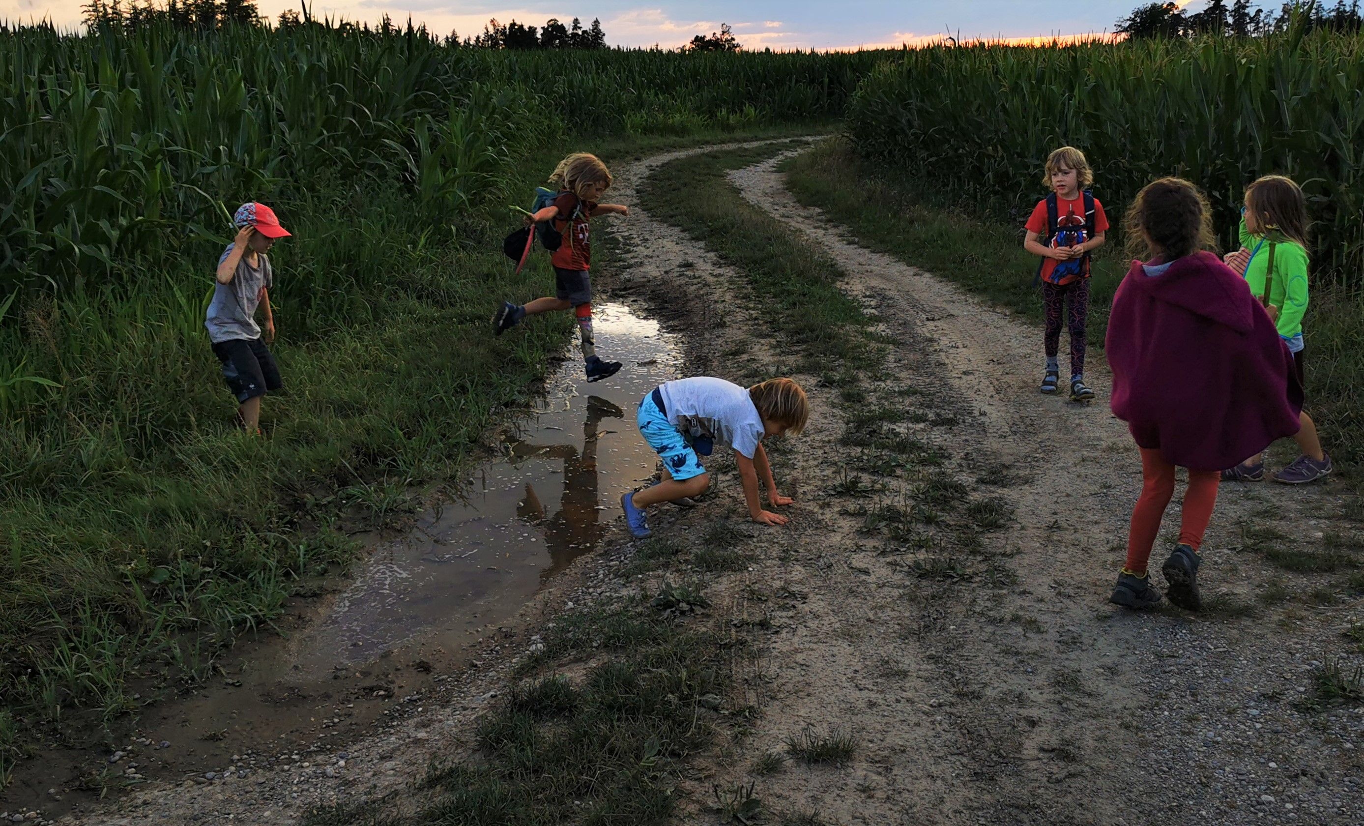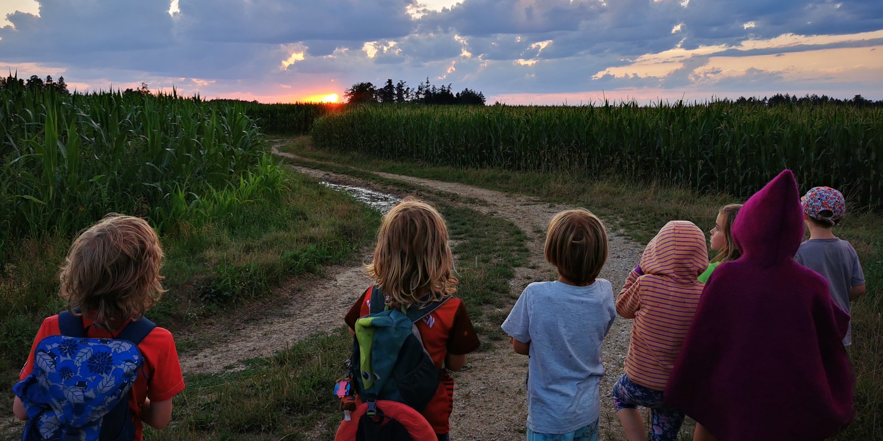 Wir trafen uns um 18.00 Uhr vor unserer Hütte. Nachdem das Essen aufgeteilt worden ist, die Rucksäcke gepackt waren, marschierten wir los durch den abendlichen Wald. Die Kinder vergnügten sich am Maisfeld, sprangen über Pfützen, spielten und genossen das reichhaltige Buffet. Wir staunten über die schönen Wolkenformationen und die Abendstimmung. Als es schon fast finster wurde, gingen wir durch den dunklen und jetzt doch etwas unheimlichen Wald wieder zurück.