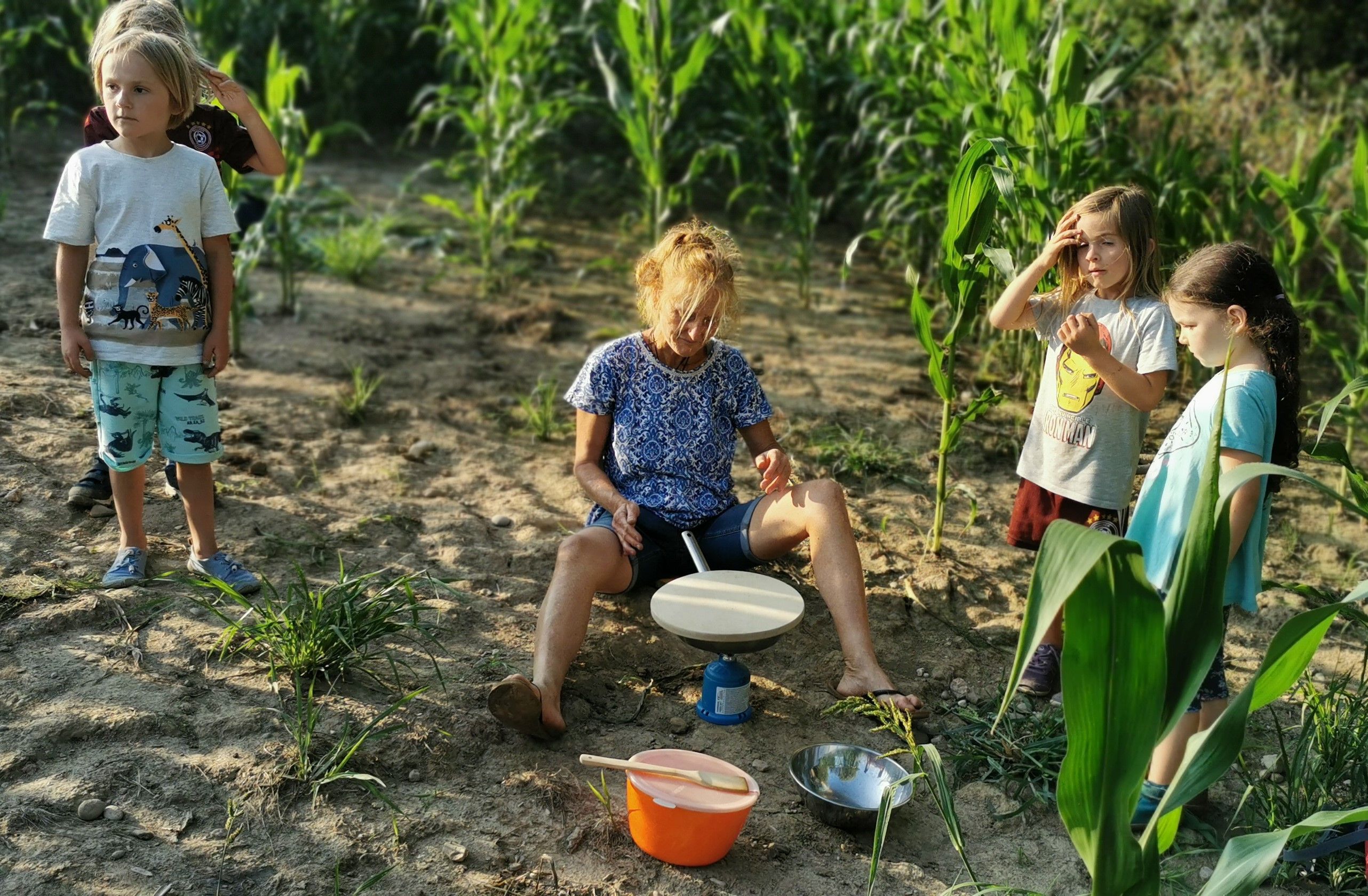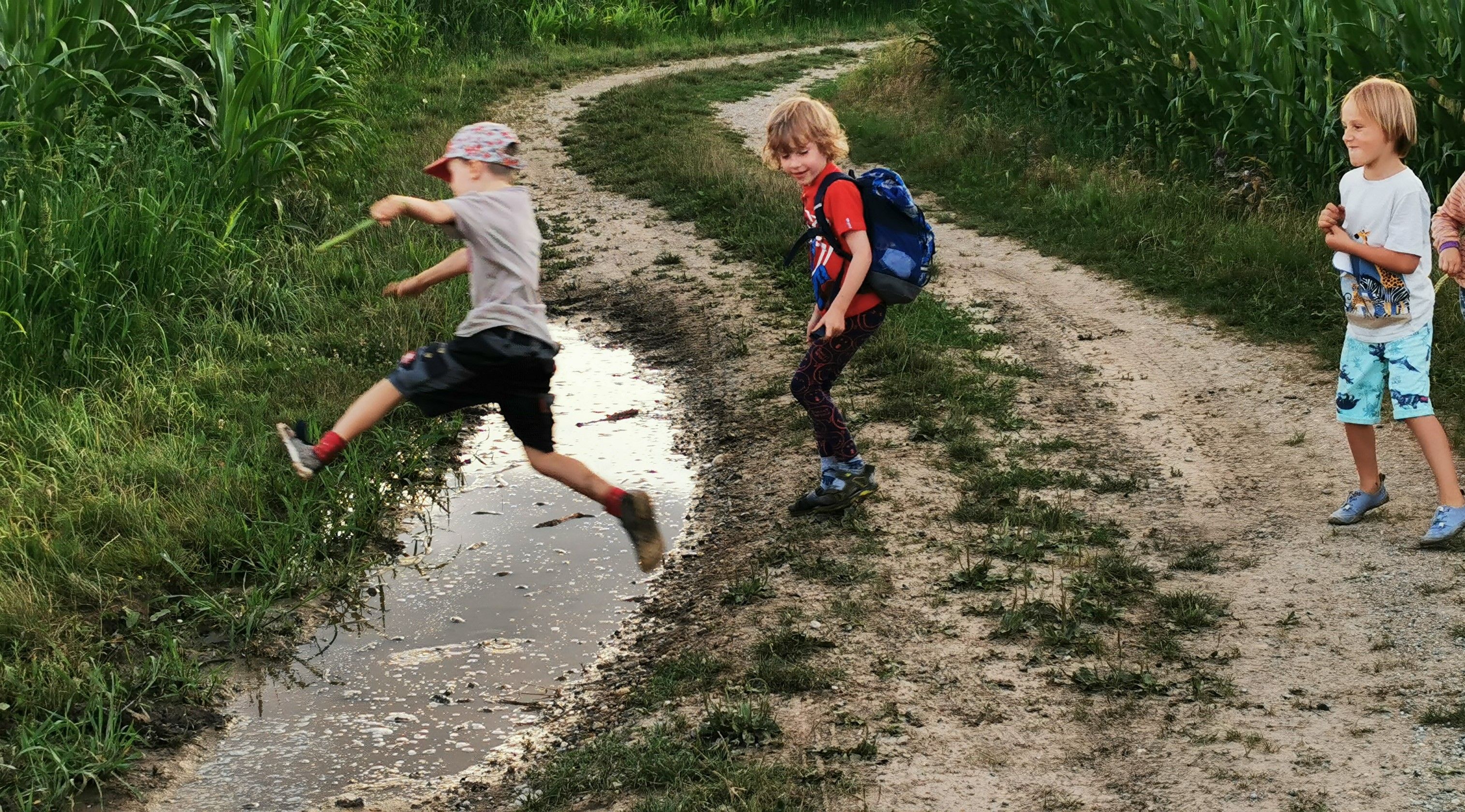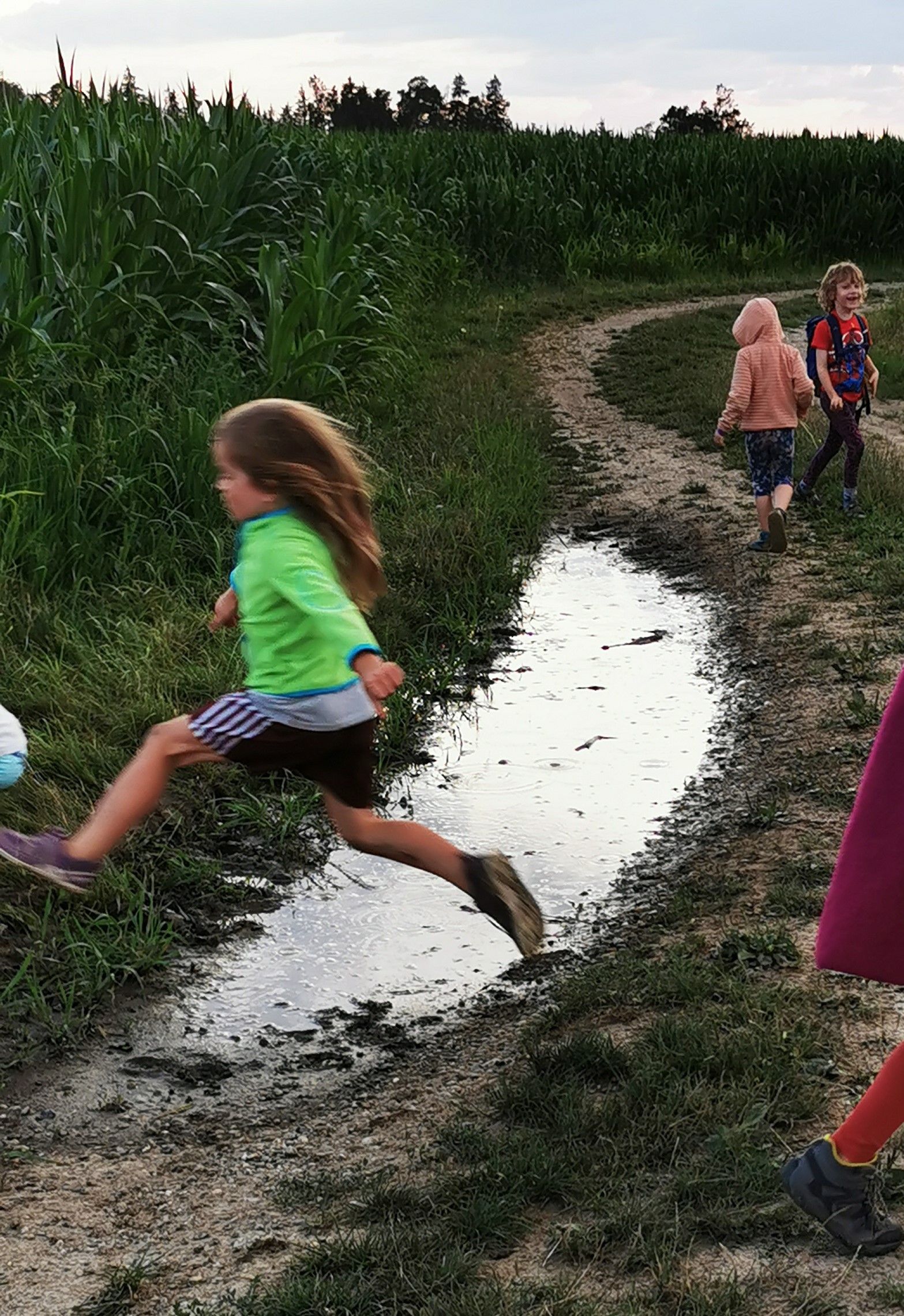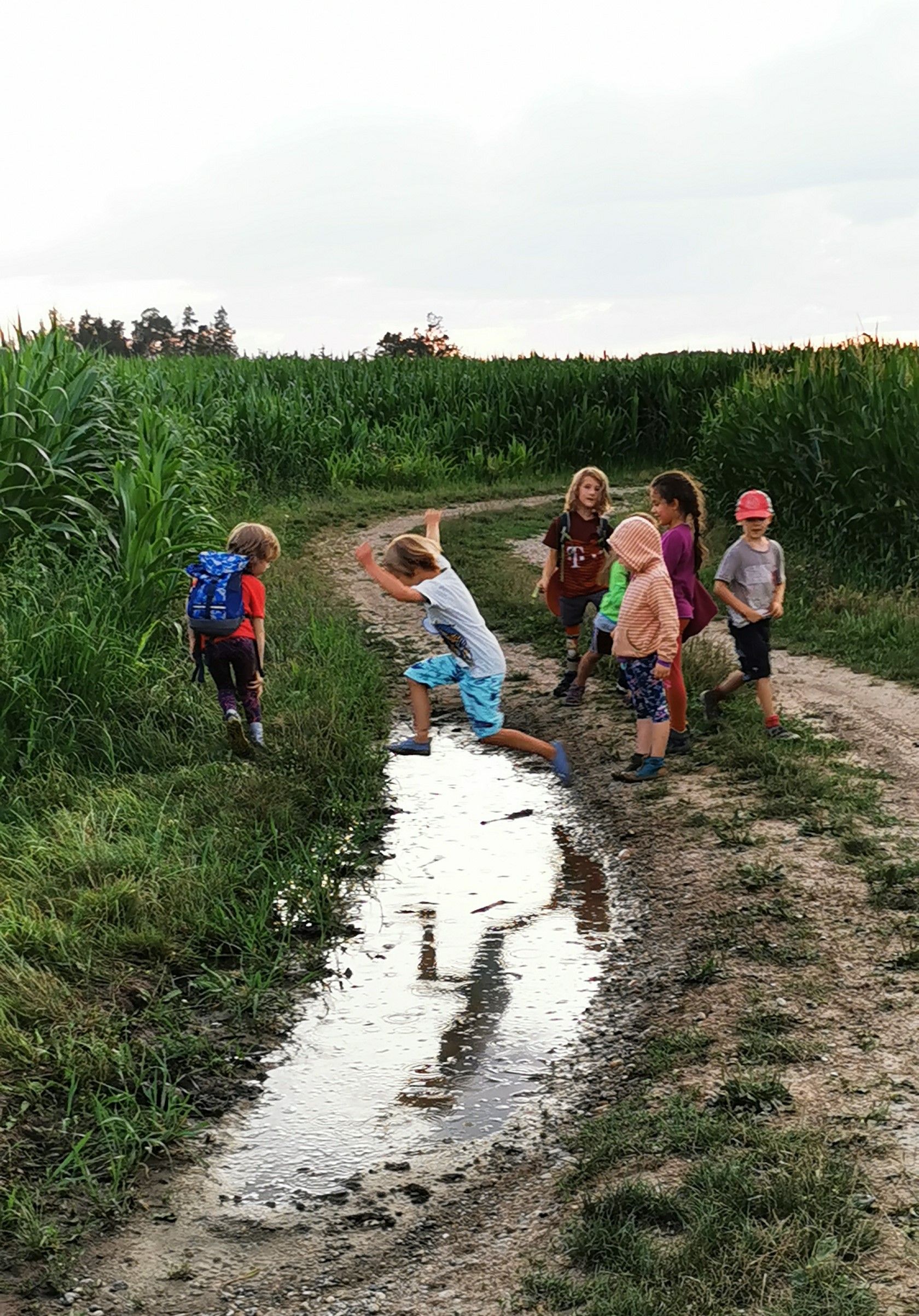 Wir trafen uns um 18.00 Uhr vor unserer Hütte. Nachdem das Essen aufgeteilt worden ist, die Rucksäcke gepackt waren, marschierten wir los durch den abendlichen Wald. Die Kinder vergnügten sich am Maisfeld, sprangen über Pfützen, spielten und genossen das reichhaltige Buffet. Wir staunten über die schönen Wolkenformationen und die Abendstimmung. Als es schon fast finster wurde, gingen wir durch den dunklen und jetzt doch etwas unheimlichen Wald wieder zurück.