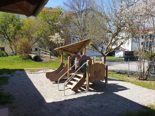 Wir haben einen Garten mit Bäumen und einem Pflanzbereich mit vielen Möglichkeiten zum Entdecken, Bewegen, Beobachten und Spielen: