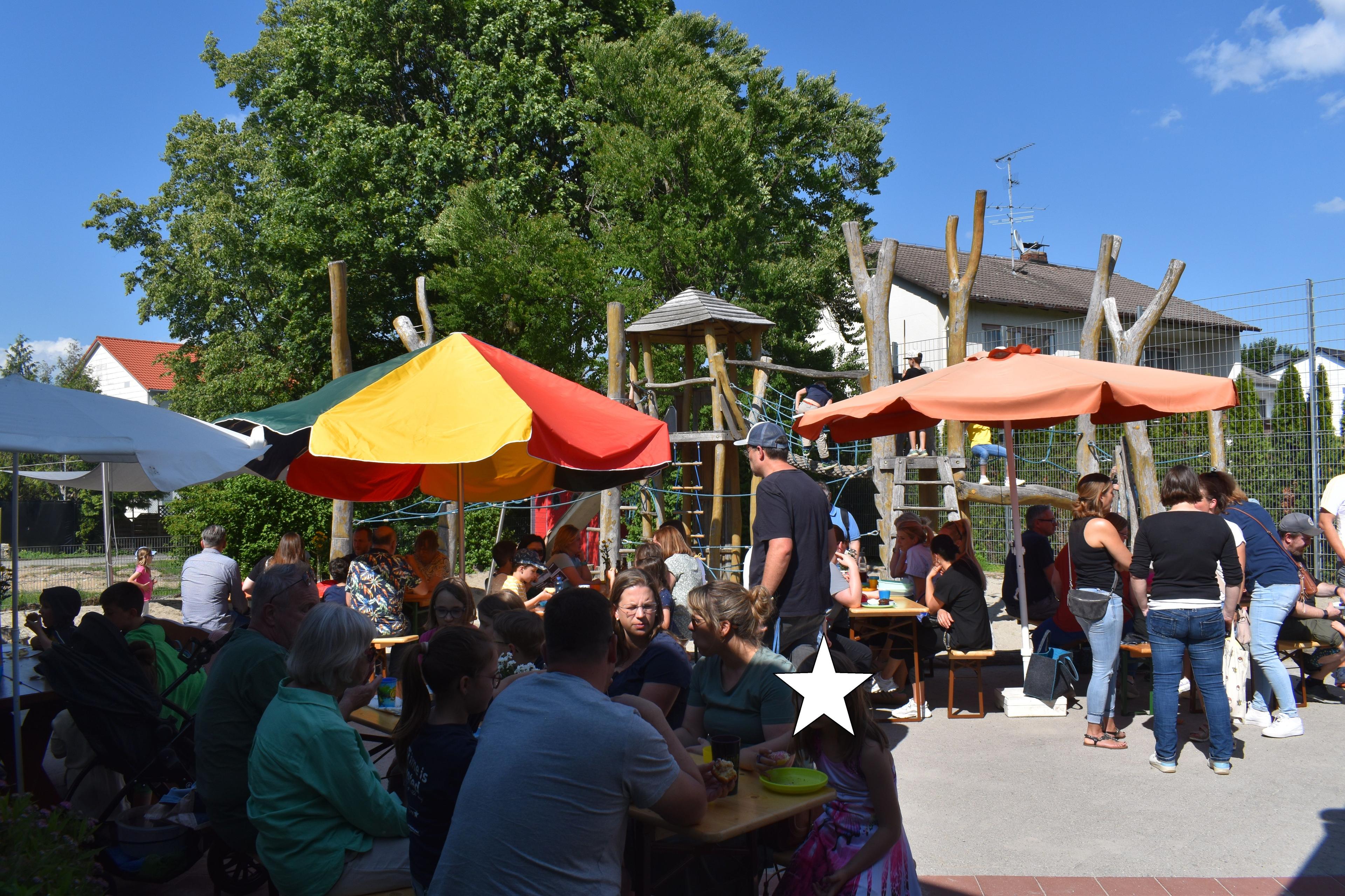 Wir haben einen Garten mit Bäumen und einen Pflanzbereich mit vielen Möglichkeiten des Entdeckens, Bewegens, Beobachtens und Spielens (angrenzender Sportplatz der Schule, Klettergerüst mit Rutsche, Sandkasten, Schaukeln, Wippe, Pumpbrunnen, Holzhäuser, Spielgeräte, Fahrzeuge).