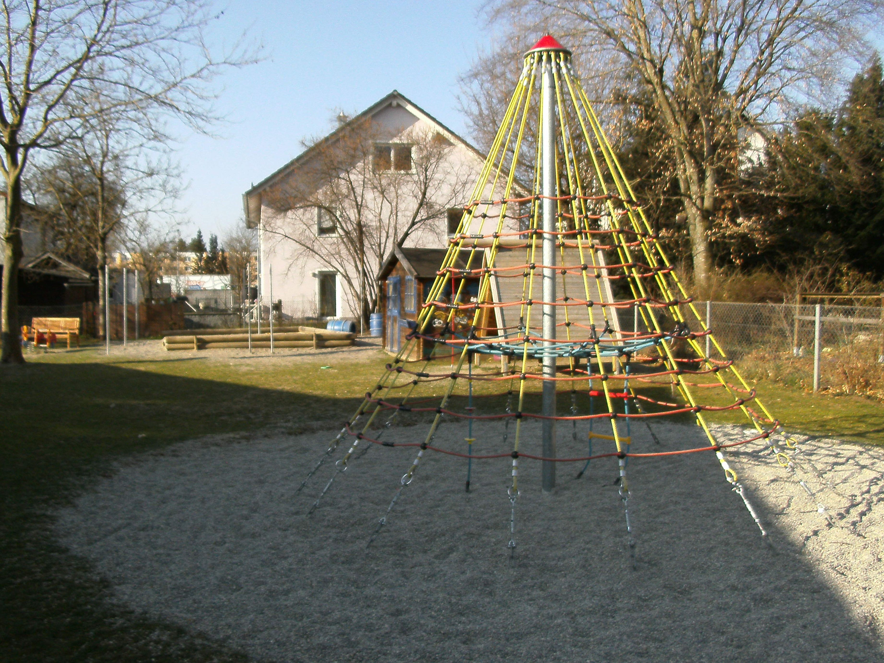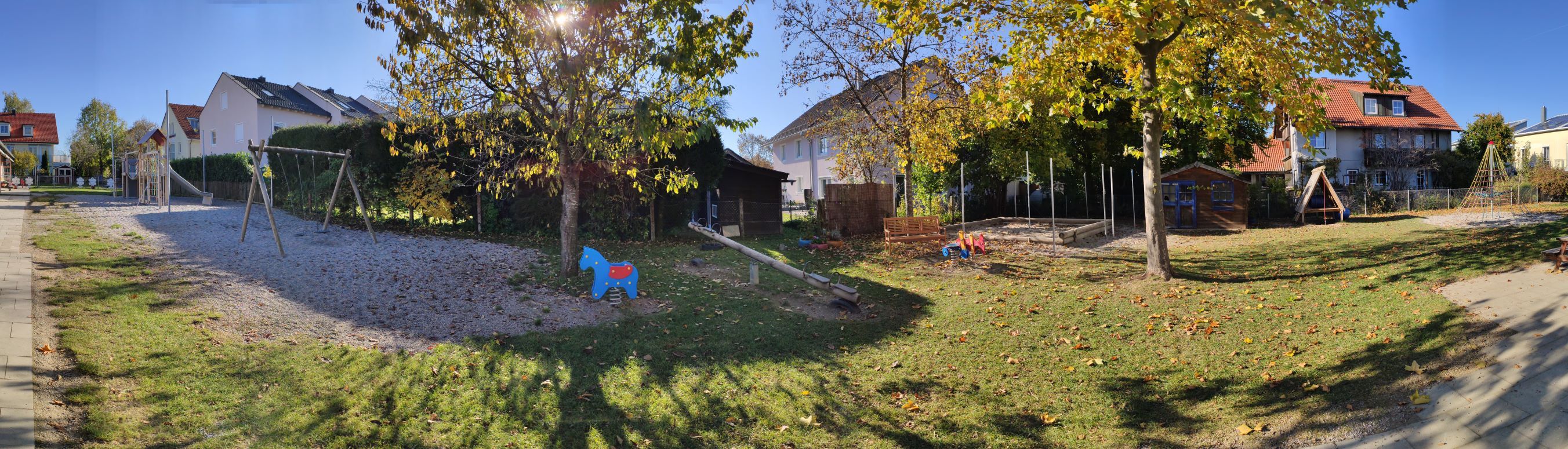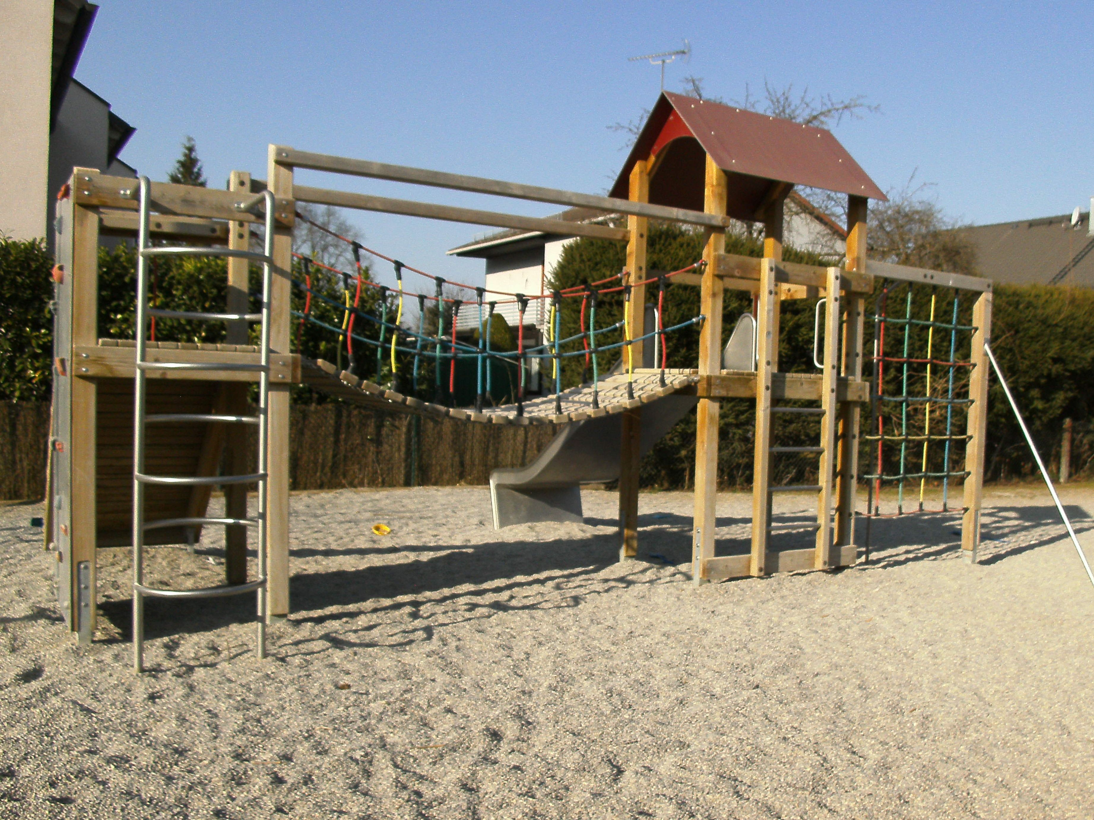 Wir haben einen großen Garten mit vielen Spiel- und Bewegungsmöglichkeiten. Dort befinden sich zwei Sandkästen, eine überdachte Rutsche, zwei Schaukeln, eine Balancierbrücke, eine Wippe, ein Spielhäuschen, sowie zwei Spiel- und Geräteschuppen.