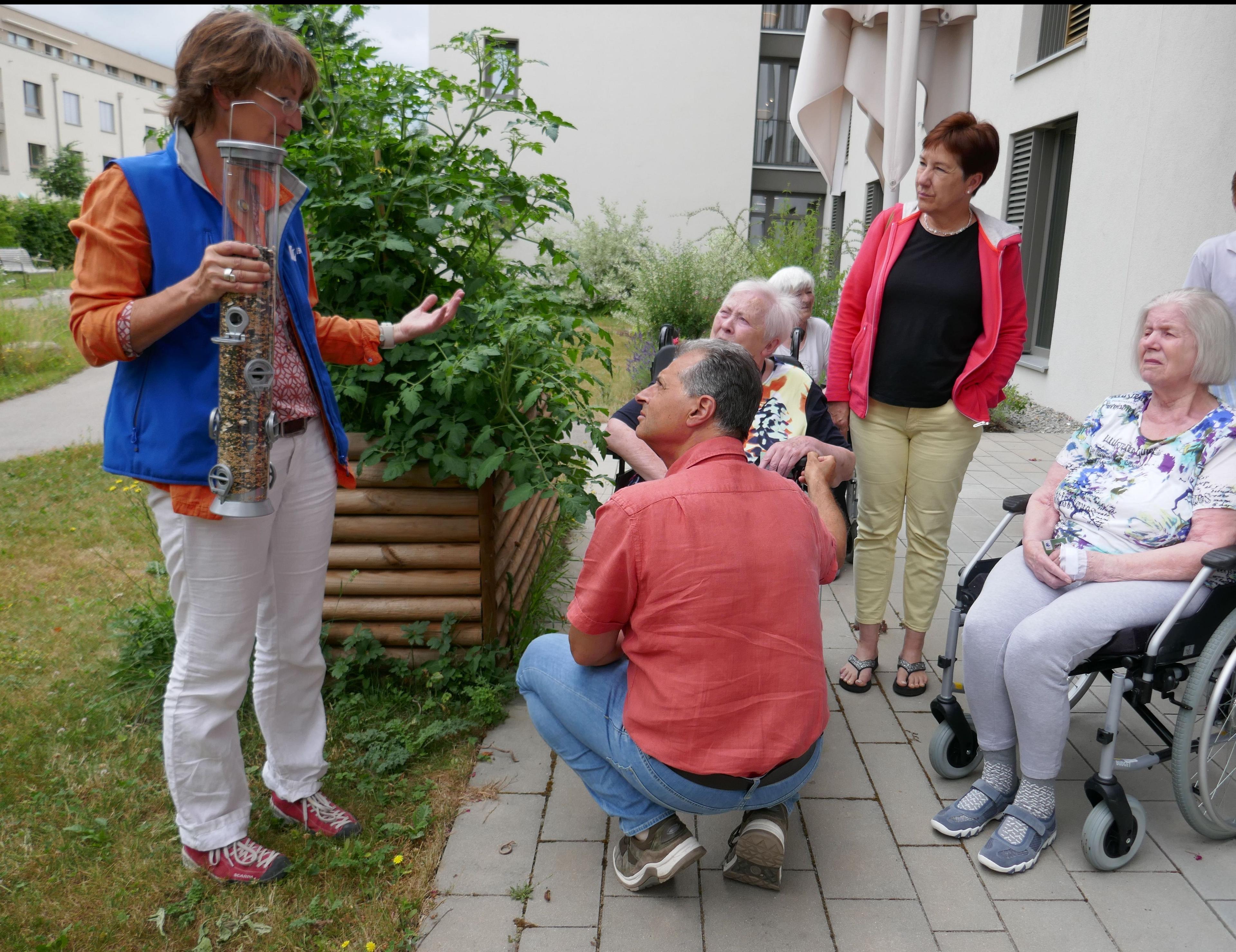Seit Ende Juni 2023 läuft das Projekt auch in unserem AWO-Zentrum in Freilassing und in unserem AWO-Seniorenzentrum in Ismaning. Auftakt war eine Veranstaltung für die Bewohner*innen, bei der nach einem kurzweiligen Vortrag die Futterstation im Garten aufgestellt wurde.