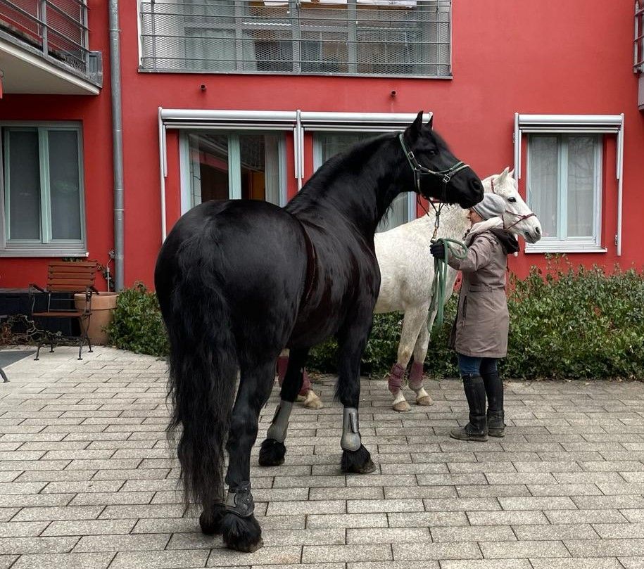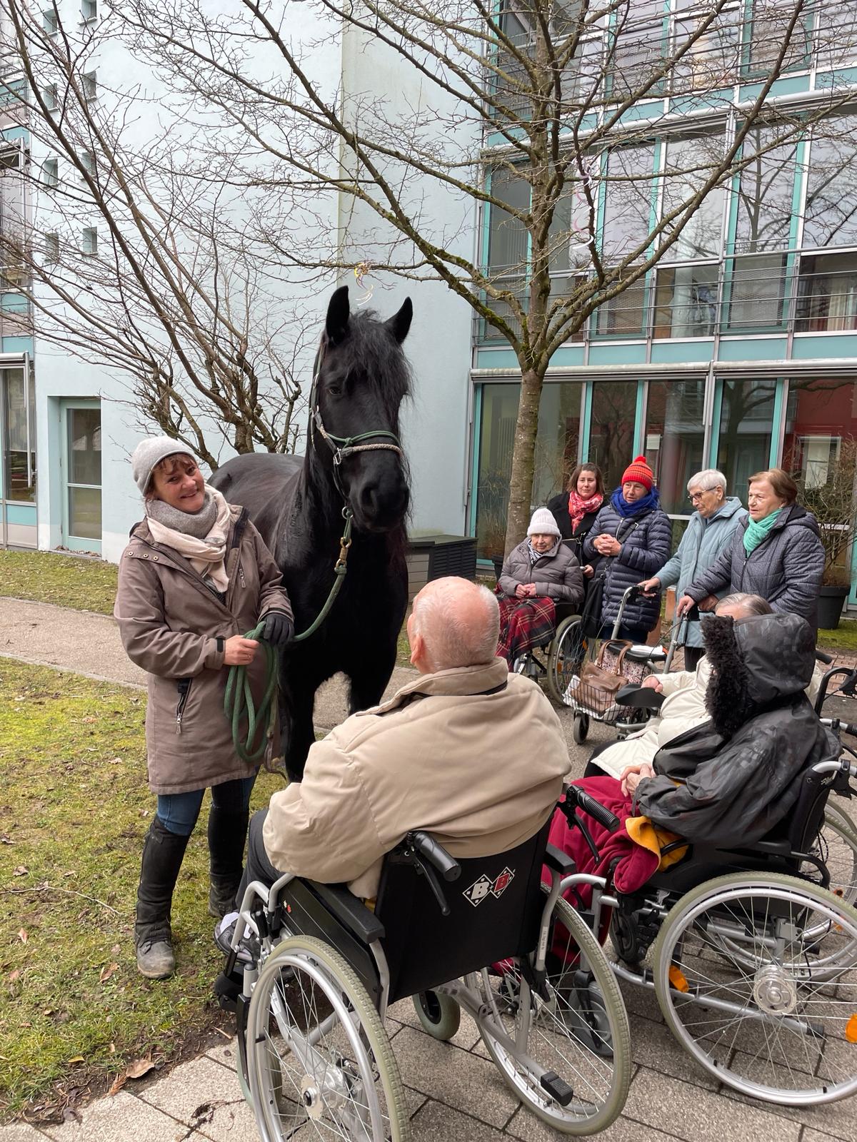 Die Bewohner*innen staunten nicht schlecht, als plötzlich gleich zwei der anmutigen Tiere von der Wohnbereichsleitung aus dem ersten Stock Corinna Pröls und Reitlehrerin Melanie Gotthelf durch den Garten und vor die Cafeteria geführt wurden. Sofort ging ein Raunen durch die Menge, Hälse wurden gereckt und erste Mutige trauten sich, an die Pferde heranzutreten und diese zu streicheln. Nach kurzer Zeit kamen immer mehr Bewohner*innen dazu, um die schönen Vierbeiner aus der Nähe betrachten zu können. Eine ganze Weile standen Mensch und Tier freudig beisammen, ehe die außergewöhnlichen Gäste uns wieder verließen.
