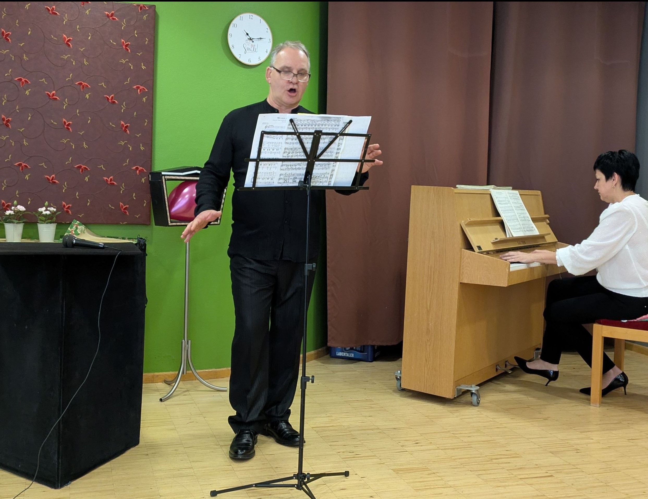 Zum wiederholten Male besuchte uns Herr Sergey Drobyshevskiy, der mit seiner „Truppe“ deutschlandweit auftritt. Er begrüßte die Zuschauer und stimmte mit populären Liedern auf einen gemütlichen Vormittag ein. Die Pianistin Alena Lebiecka begleitete ihn dabei auf dem Klavier. So konnten die Gäste ein Potpourri aus fröhlichen Weisen, wie dem „weißen Rössl am Wolfgangssee“ hören und im Takt von „Ich küsse ihre Hand, Madame“ wiegen.
