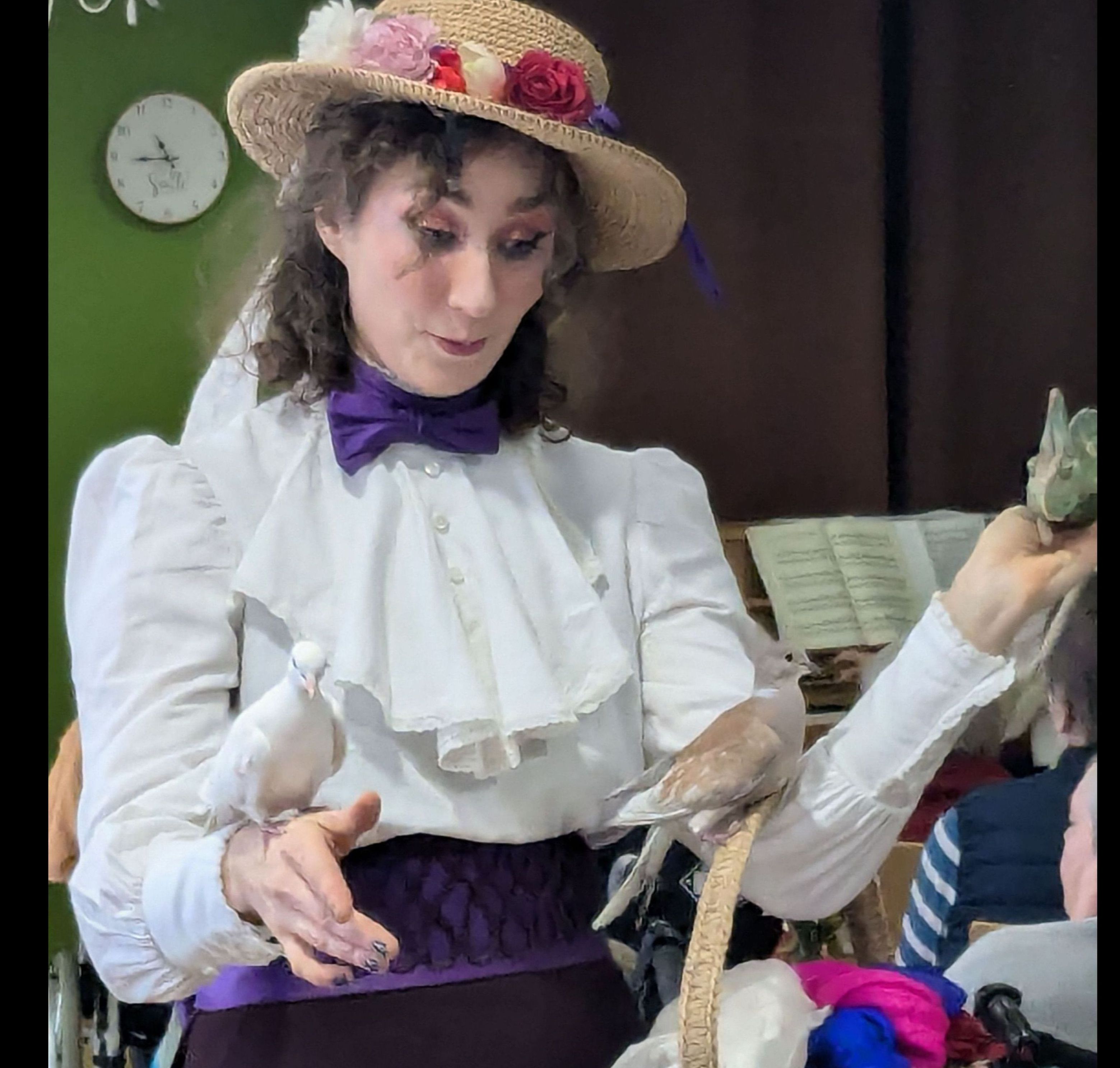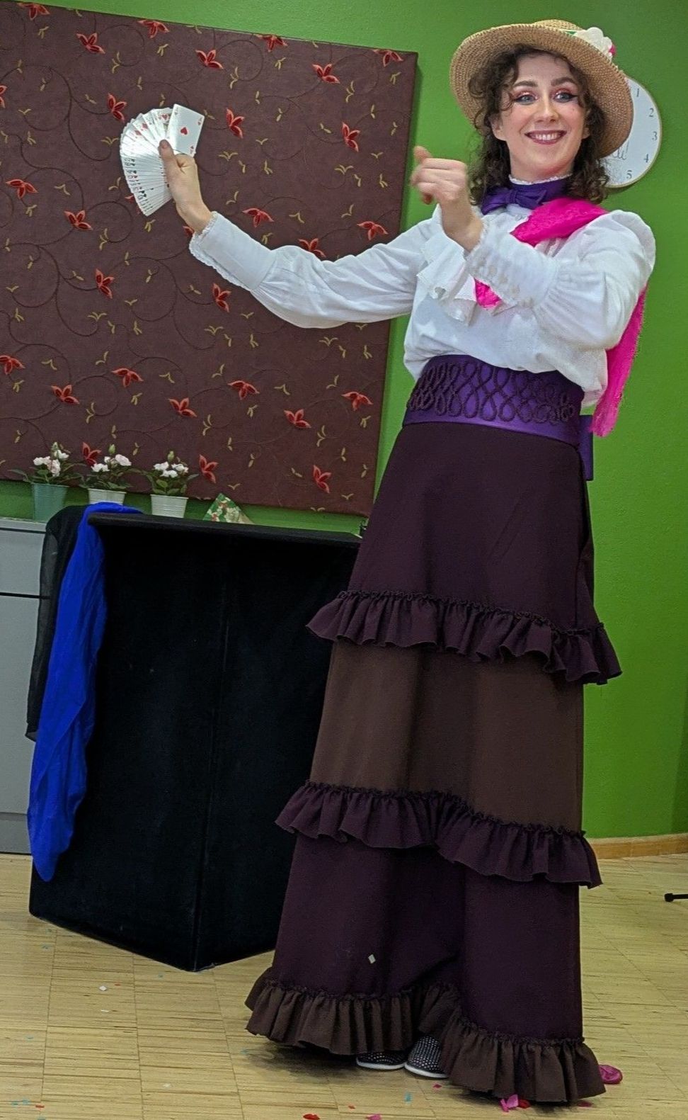 Der zweite Teil der Veranstaltung wurde von Herrn Drobyshevskiy als Momente von magic angekündigt und auf der Bühne erschien eine junge Blumendame, die aus dem Varietè entsprungen schien. Die Darbietungen der Zauberin Jeanna, die im realen Leben Zanna Nimcika heißt, wurden mit Klaviermusik untermalt. Jeanna verzauberte das Publikum mit ihren Künsten und brachte damit so manches Lächeln und Erstaunen in die Gesichter der Zuseher. So ließ sie zwei unterschiedlich bunte Strümpfe aus einem Sack ziehen und hatte erstaunlicherweise den jeweils zweiten Strumpf selbst an. Als sie dabei ihren Rock lupfte, bekam der eine oder andere große Augen. Eine Zeitung, die sie in Stücke riss, war wie aus Geisterhand auf einmal wieder ganz oder sie steckte große Metallringe, die keine Öffnung hatten, so ineinander, dass eine Kette daraus wurde. Wie es sich für einen Magier gehört, holte sie auch jede Menge an Skatkarten aus ihrem Ärmel. Ein großes Oh und Ah ging durch die Reihen, als sie eine Taube nach der anderen aus der Tasche holte und sie im Raum herumfliegen ließ. Das Staunen erreichte seinen Höhepunkt, als sie auch noch eine Echse aus einem Ei schlüpfen ließ. Mit dem Lied „Mein kleiner grüner Kaktus“ und einem riesigen Applaus verabschiedeten sich die Drei wieder von Ihren Gästen.