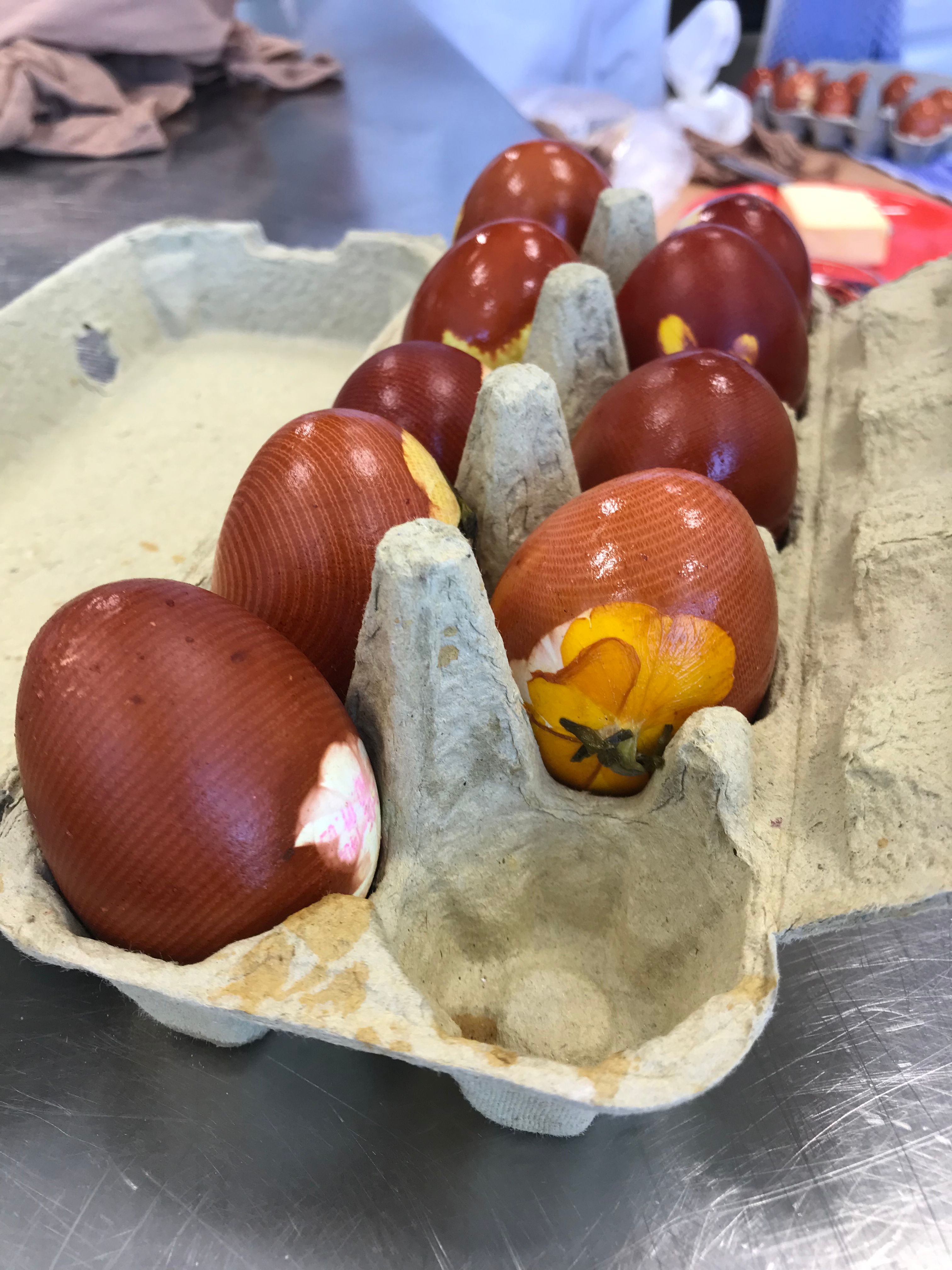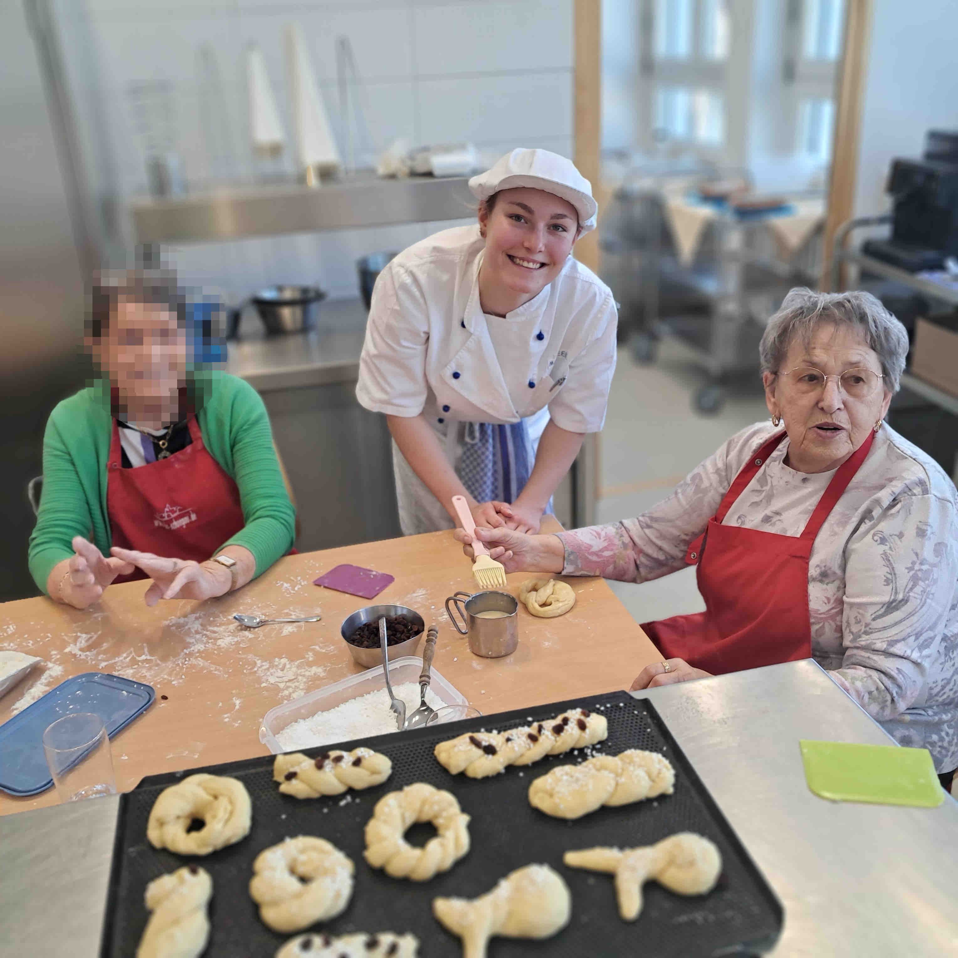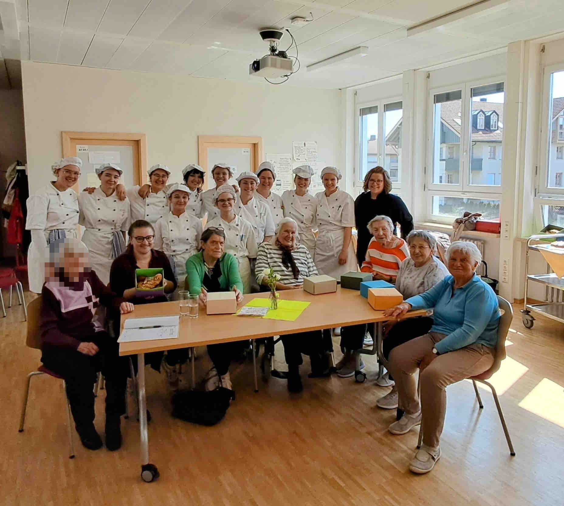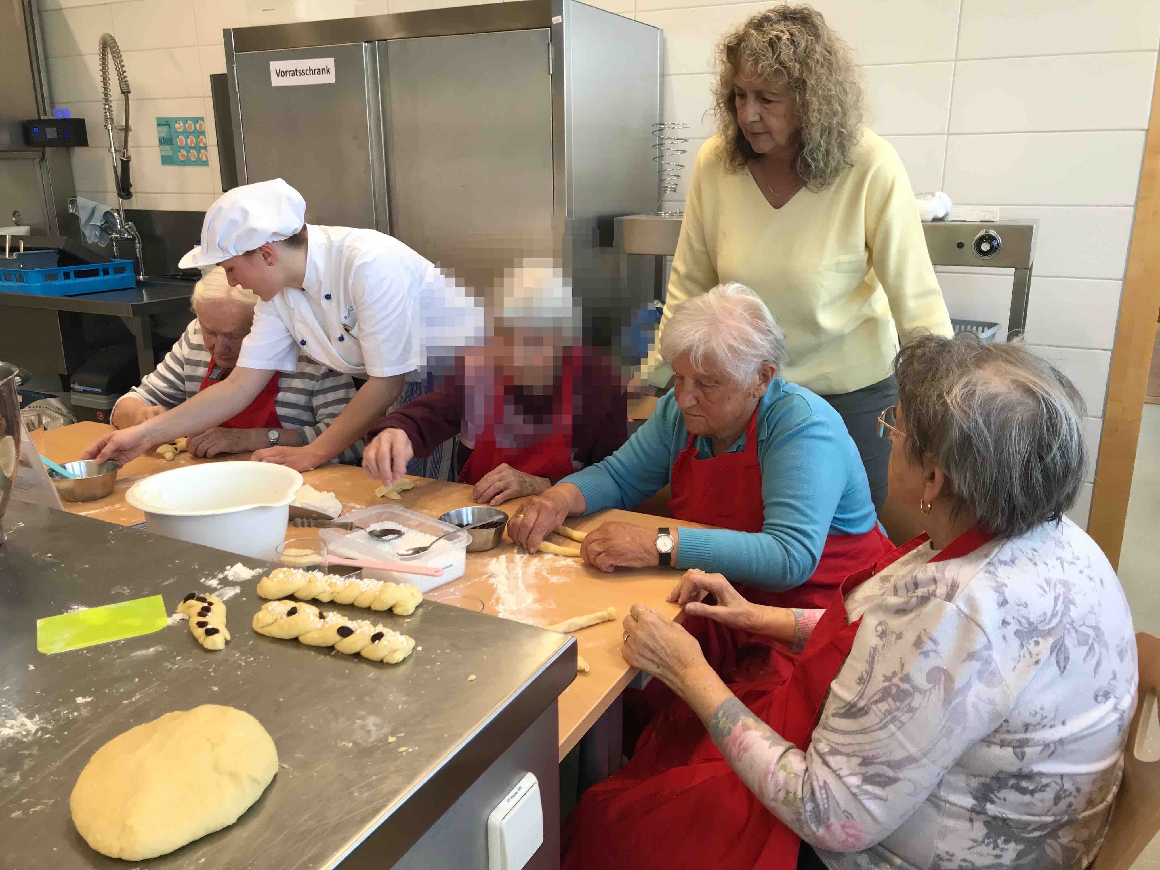 Ein besonderes Geschenk machten uns die Schüler*innen der Hauswirtschafts- und Sozialpflegeklasse der Berufsschule Schongau. Bei schönstem Wetter ging es mit dem Bus in die Schule, wo wir mit einem glotten Sitztanz begrüßt wurden, der müde Glieder munter machte. Unsere Kreativität konnten wir beim Färben von Eiern mit Blüten ausleben und leckere Rezepte für Ostergebäck ausprobieren. Nach getaner Arbeit, überraschten uns die jungen Hauswirtschafterinnen mit Kaffee und Kuchen, der uns fantastisch schmeckte. Reich beschenkt bleibt uns dieser wunderschöne Vormittag lange in Erinnerung.