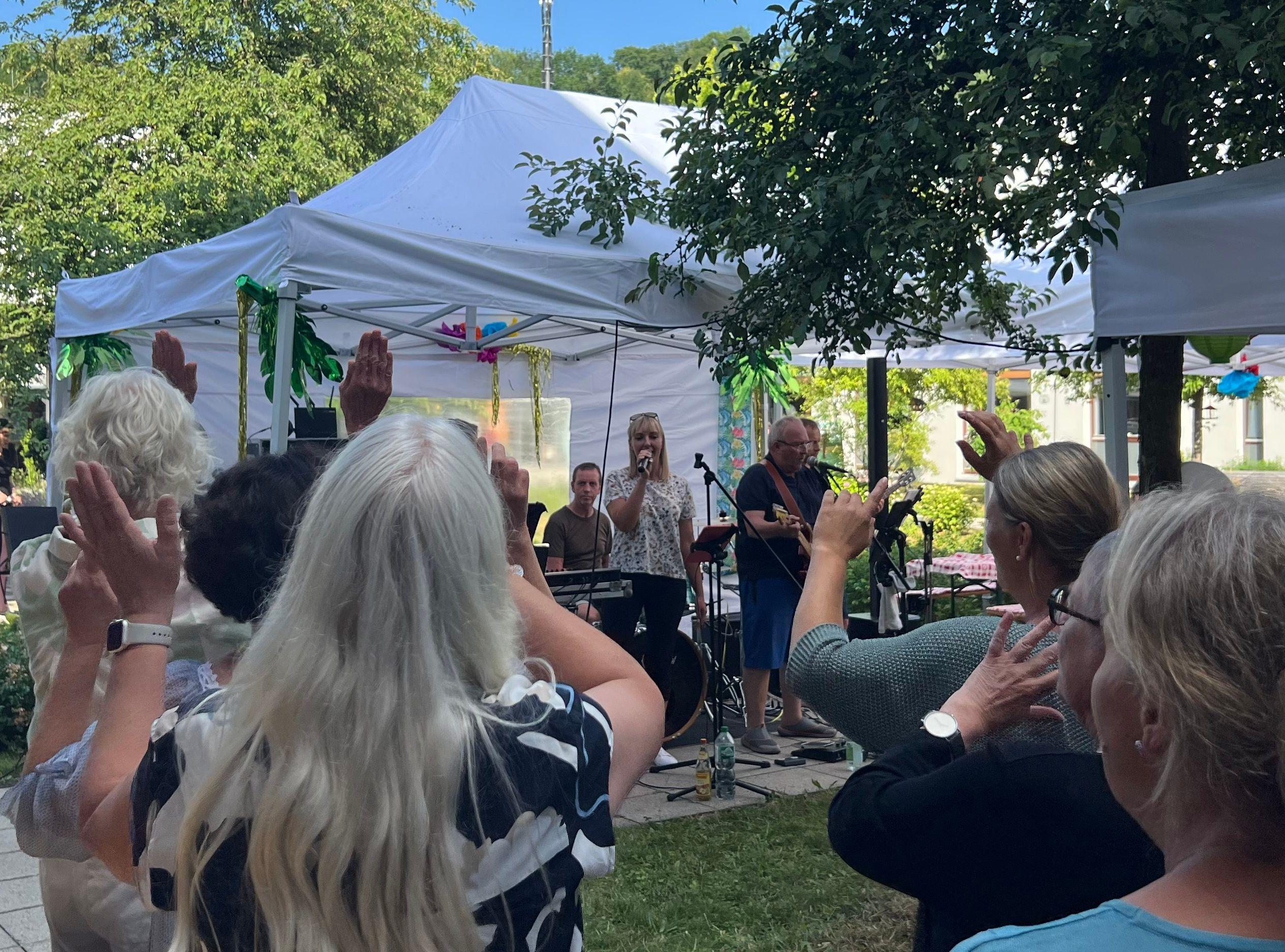 Dass sich ein Fan sogar das Fräulein Grün herbeiwünschen durfte, brachte ein weiteres Stimmungshoch und alle Gäste feierten beim Sommerfest die Tanzkünste der Cordula Grün oder machten es ihr nach. „Ich kann mich nicht erinnern, wann es einmal so hoch herging,“ berichtete eine Bewohnerin. Und andere stimmten zu. „Das war super!“